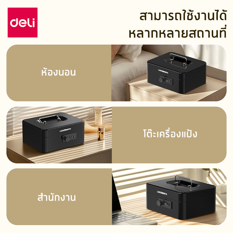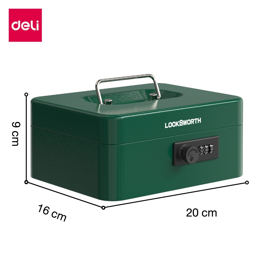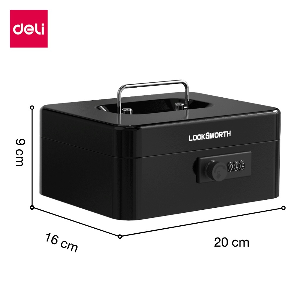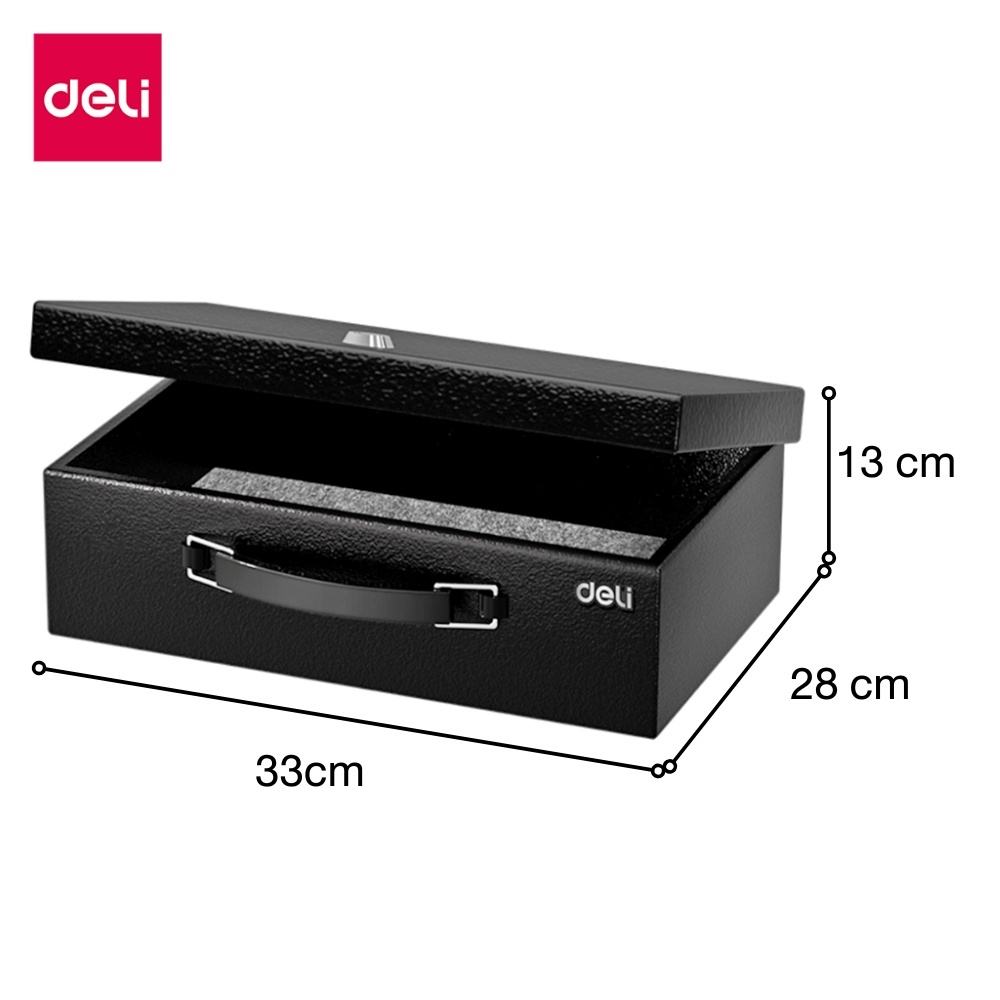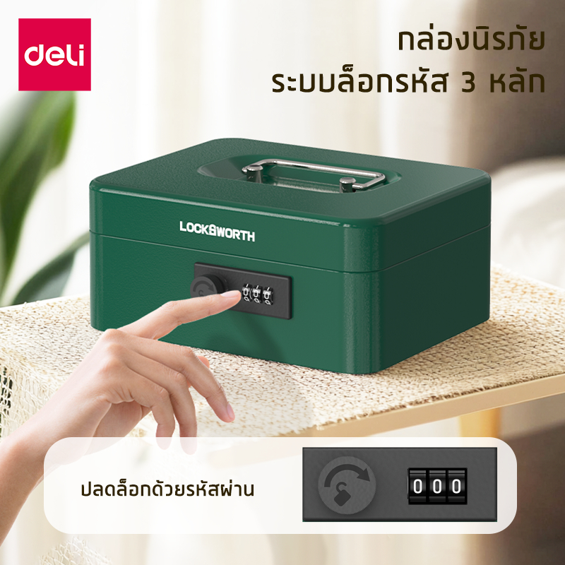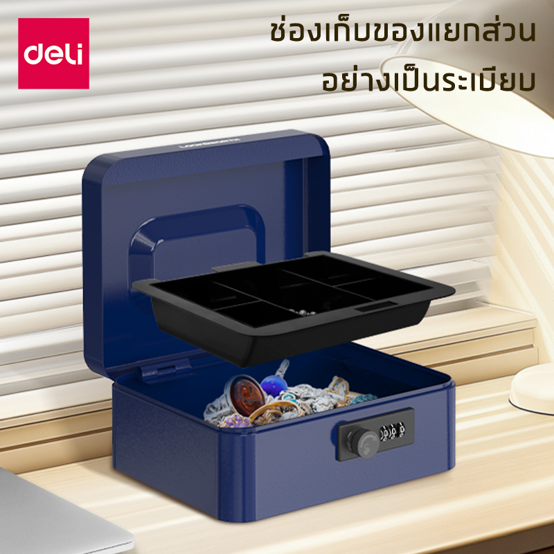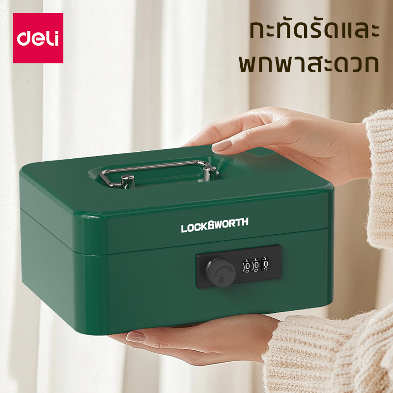 Deli กล่องเหล็กเก็บเงิน เซฟหิ้ว กันไฟ กล่องเซฟ เซฟพกพา อเนกประสงค์ มีหูหิ้ว แบบล็อครหัส Cash Box