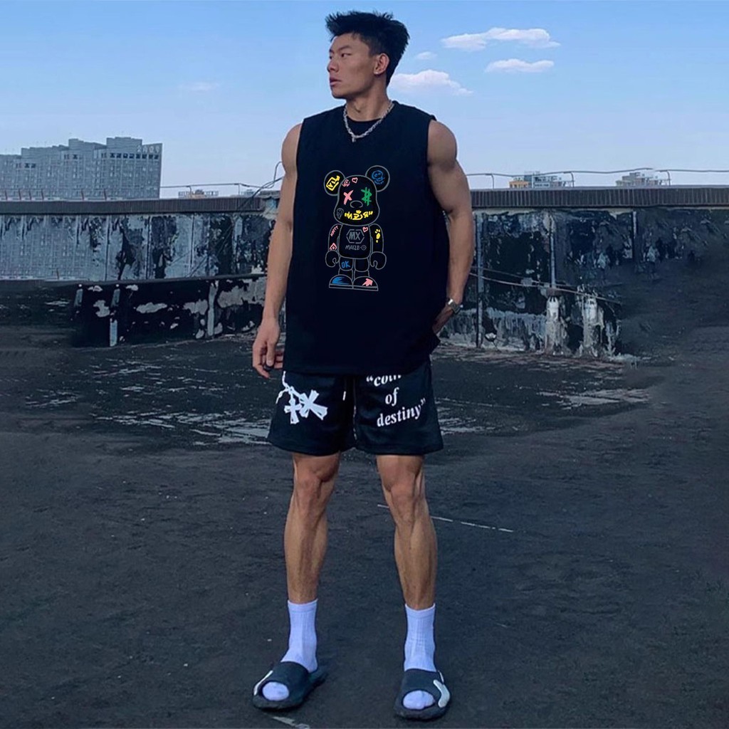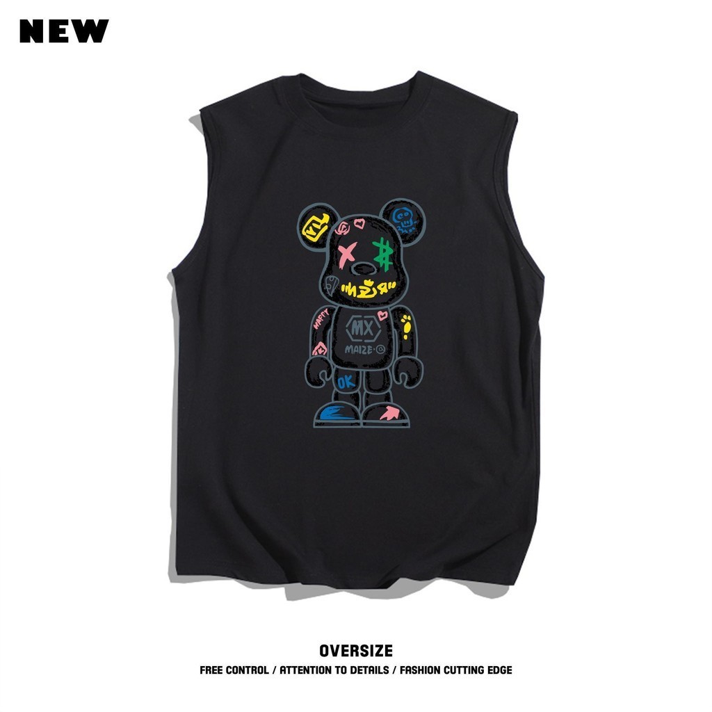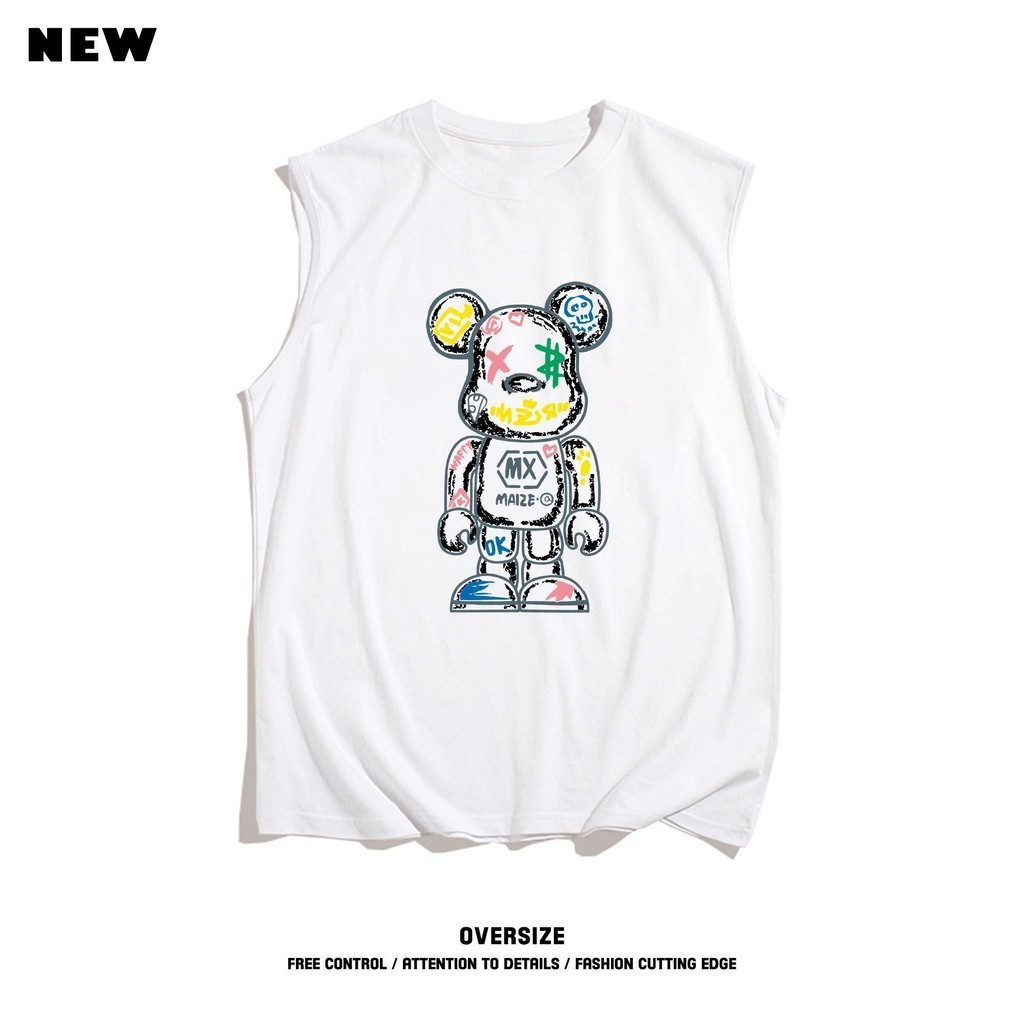 Basi เสื้อกล้ามผู้ชาย คอกลม ลายหมีวินเทจสตีทMXOK ผ้าคอตตอนแท้นิ่มใส่สบาย สไตล์เกาหลีวัยรุ่น แขนกุดฮิตมาก