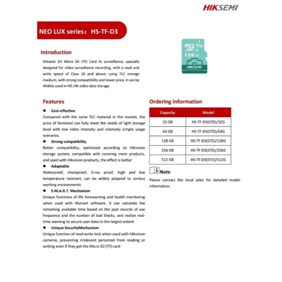 HIKSEMI NEO LUX | D3 32G/64G/128G/256G HIGH SPEED MICRO CARD CLASS 10 WARRANTY -ของแท้ประกันศูนย์ 7 ปี