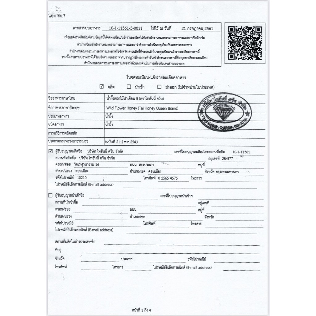 น้ำผึ้งป่าเดือนห้าขวดพลาสติก ตรา tai honey queen 1000g 12ขวดแถม 1ขวด1000g