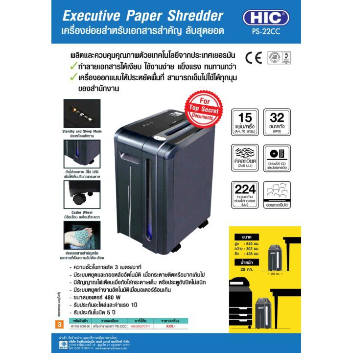 HIC เครื่องทำลายเอกสาร รุ่น PS-22CC ตัดละเอียด (Micro cut) 2*8 มม