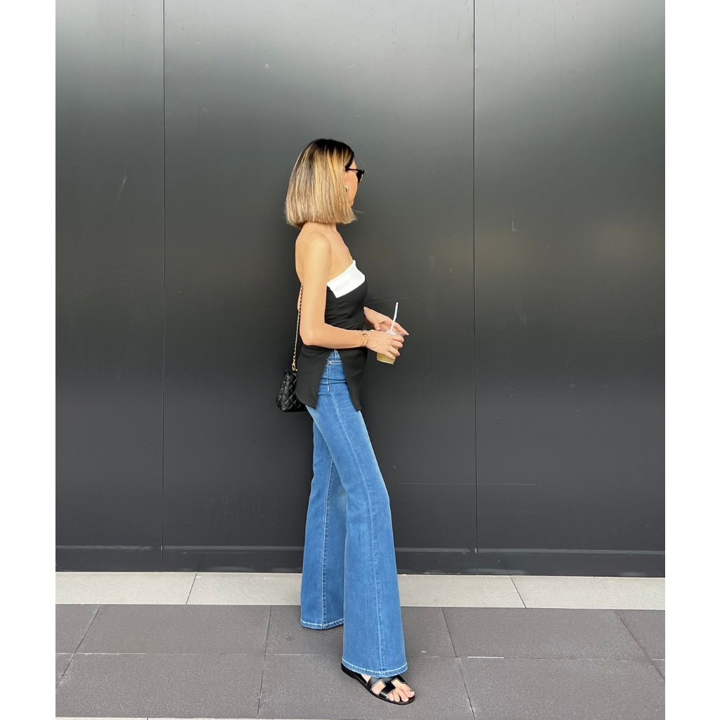 Aevelyn Jeans กางเกงยีนส์รุ่น Bowky Blue Jeans ทรงขาม้าเอวสูง (Flare Jeans) ผ้ายีนส์ฟอกสีกลาง รุ่นนี้ ผ้ายืดหยุ่น