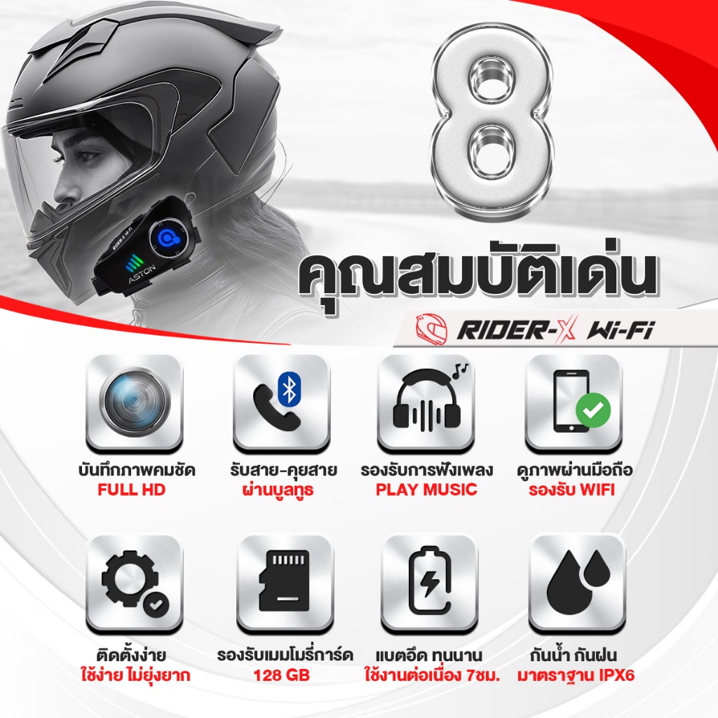 Aston Rider X กล้องติดหมวกกันน็อค กล้องติดหมวก 1080P FHD ฟังเพลง รับสาย บลูทูธ กันน้ำIPX6 ใช้ต่อเนื่อง 7 ชม รับประกัน1ปี