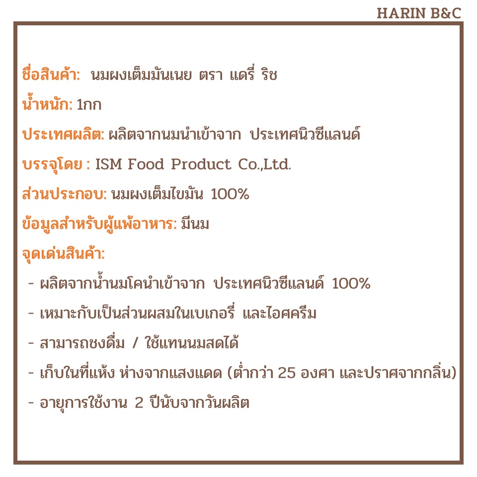 นมผงเต็มมันเนย ตราแดรี่ริช หัวนมผง 1กก. Dairy Rich Instant Full Cream Milk Powder 1kg