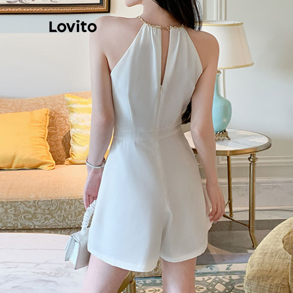 Lovito ชุดจั๊มสูทหรูหราโลหะพื้นฐานฤดูร้อน/ฤดูใบไม้ผลิ ชุดจั๊มสูท สําหรับผู้หญิง LNE30044 (สีขาว)
