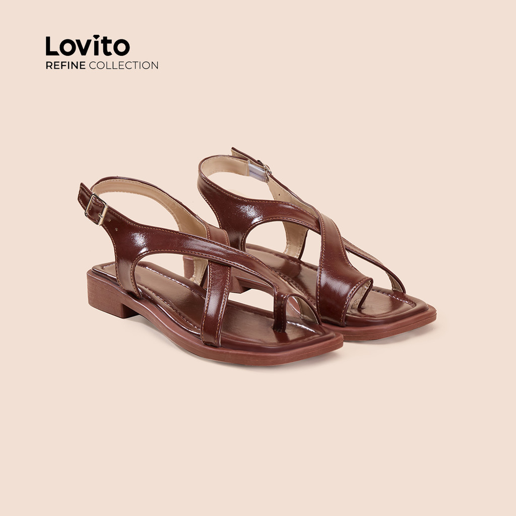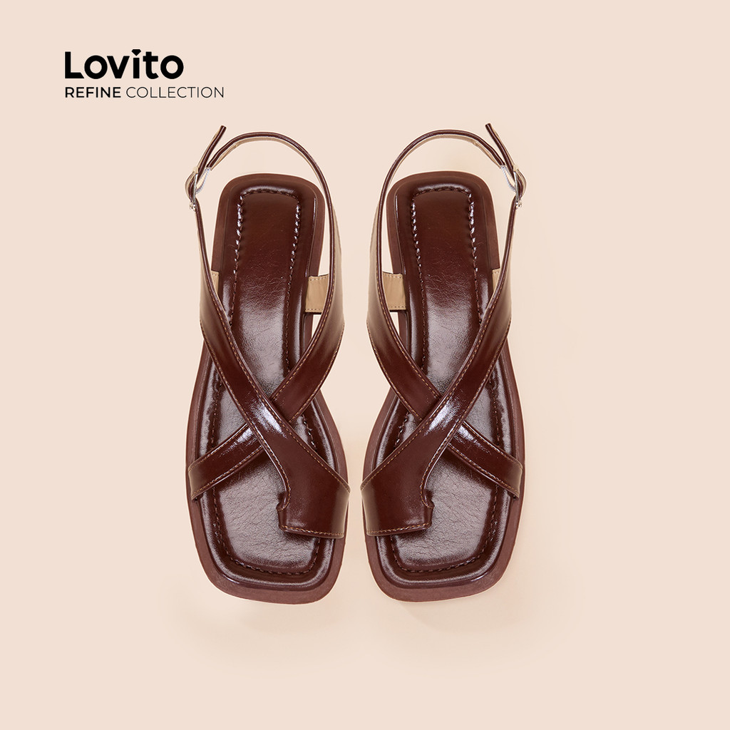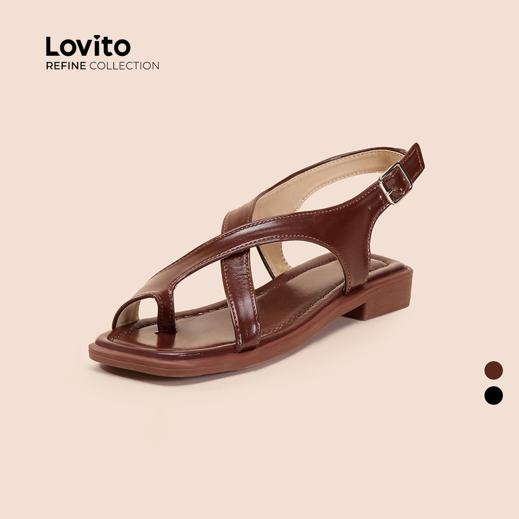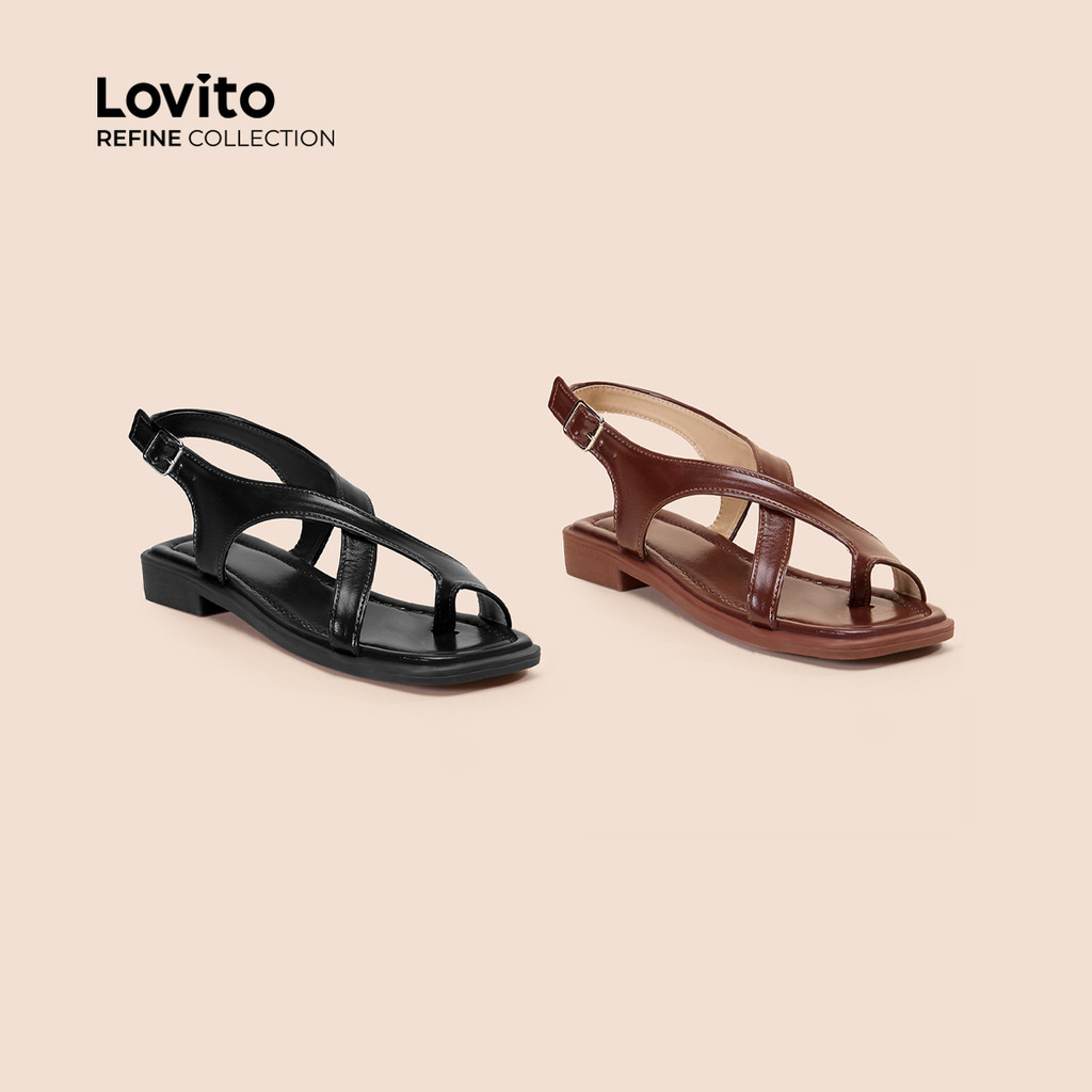 (Trendy) (Lovito Refine) รองเท sandal แบบสบาย ๆ แบบแบน สายไขว้ สปริง/ฤดูร้อน สีดำ รองเท้าส้นแบน LR13E410