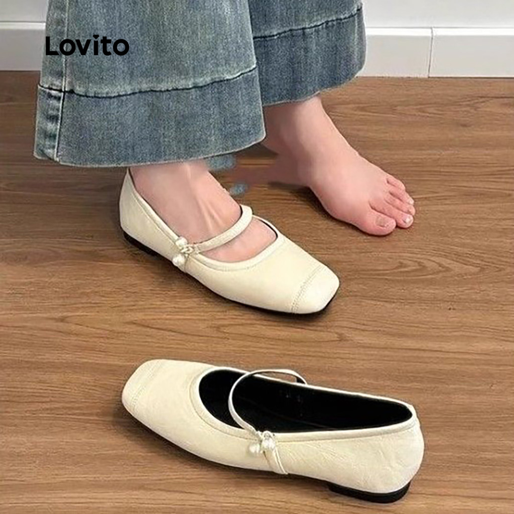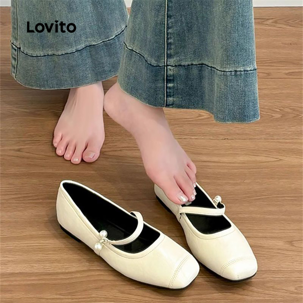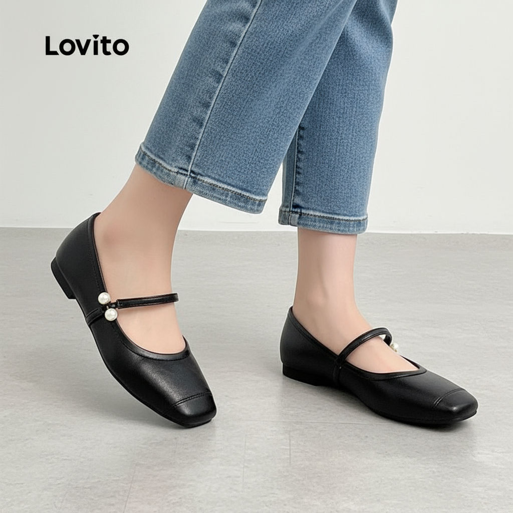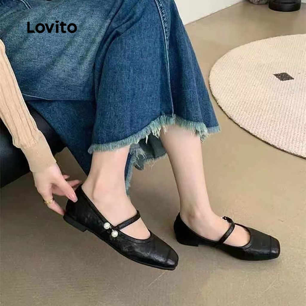 Lovito แมรี่เจนส์ประดับมุกคลาสสิก ใช้งานได้หลากหลาย ทุกฤดู สีดํา LFA87047