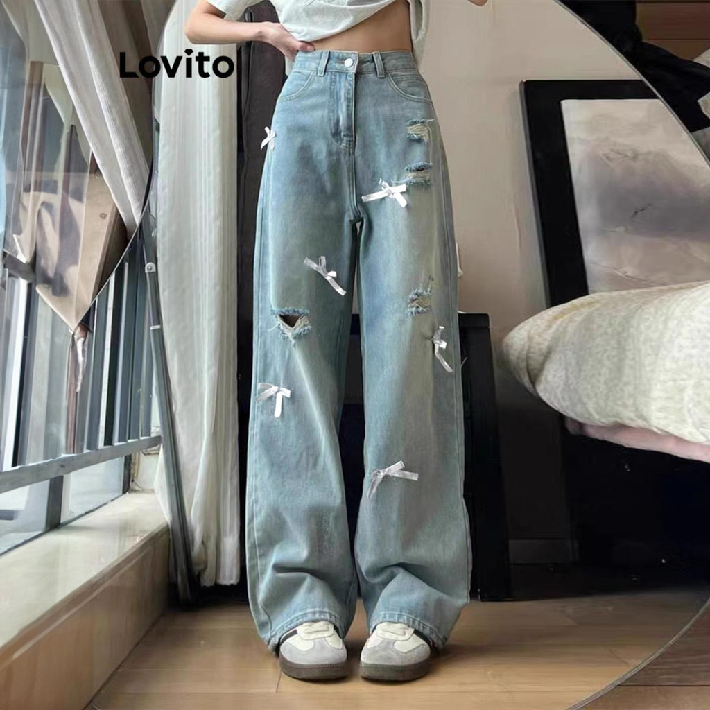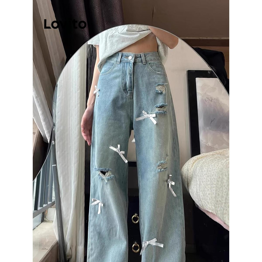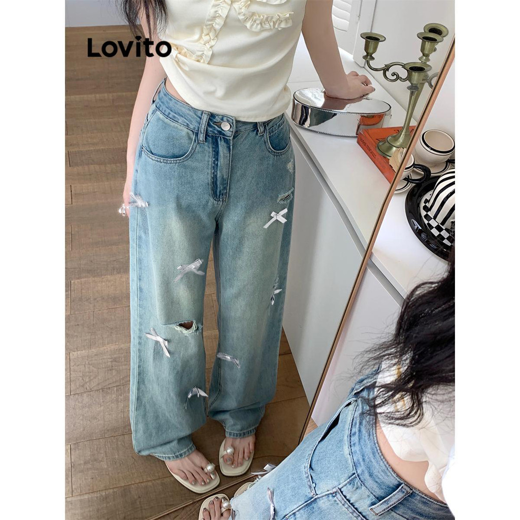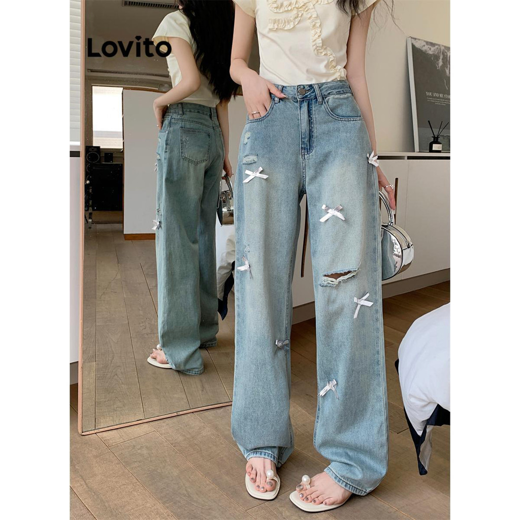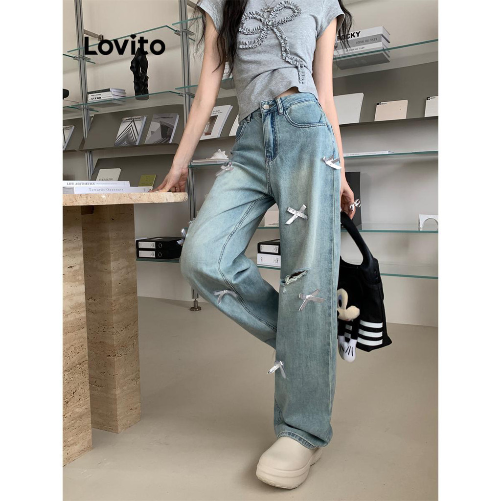 (KOL‘s pick) Lovito กางเกงยีนส์ลําลองกางเกงยีนส์โบว์ธรรมดาสําหรับผู้หญิง LNA73086