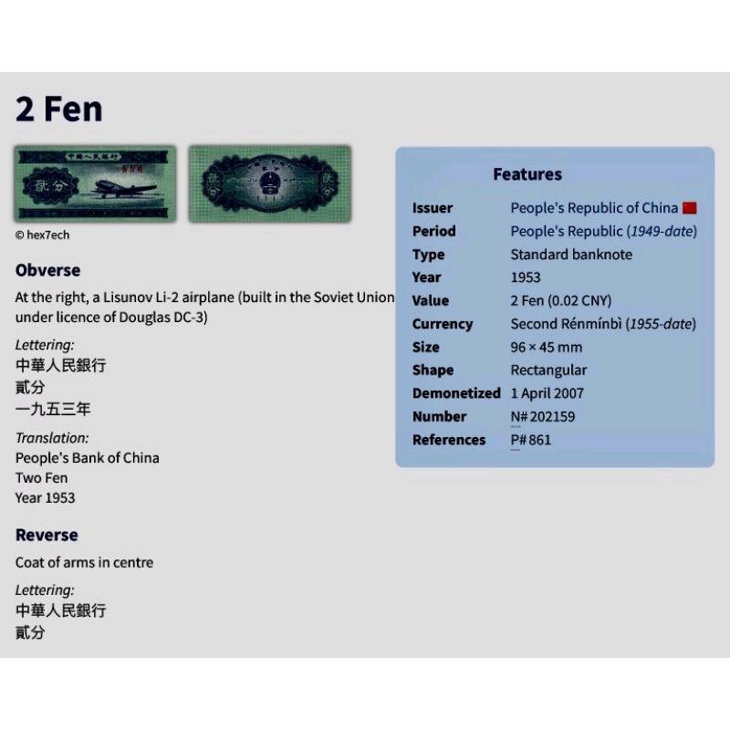 แบงก์ประเทศจีน China, 2 Fen, B726T, ไม่ผ่านใช้ UNC