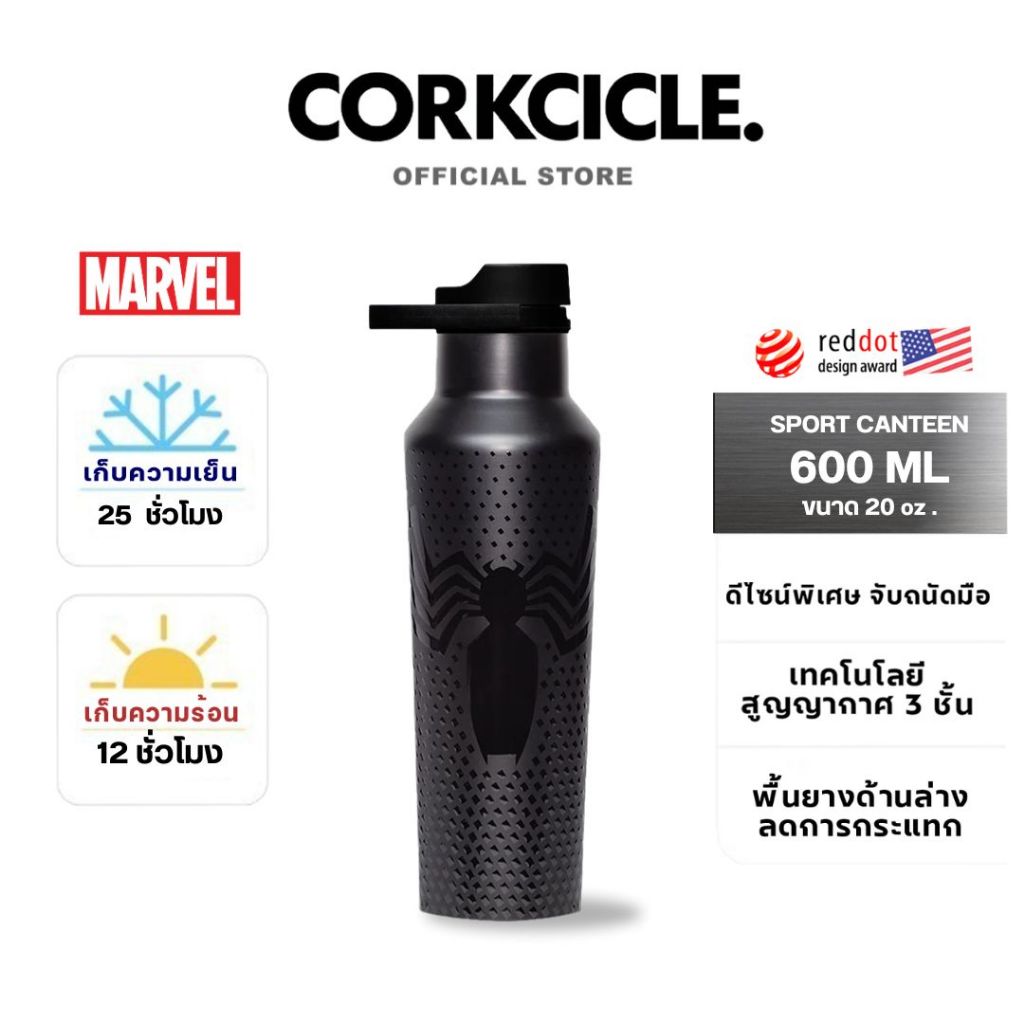 Corkcicle กระบอกน้ำ 20 oz (590 ml) Sport Canteen | Marvel Venom ดำ | Keeps Cold เก็บเย็น 25hrs | ขวดน้ําพกพา Tumbler