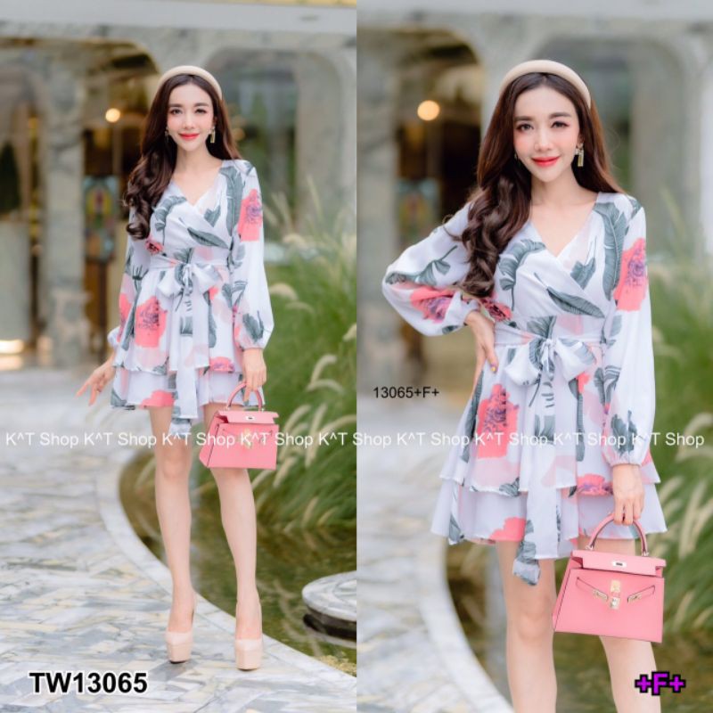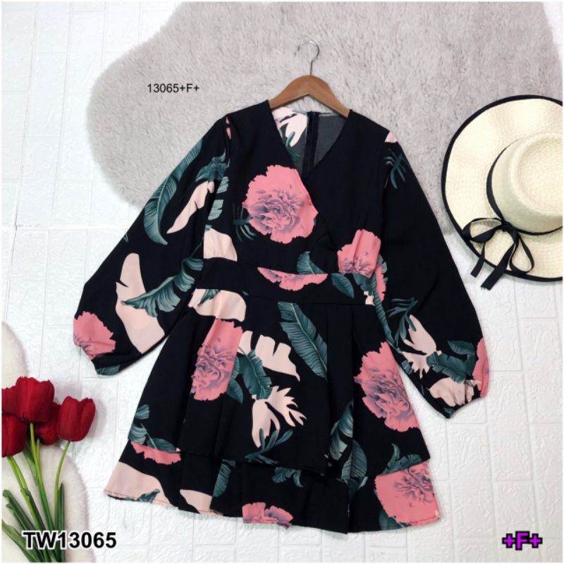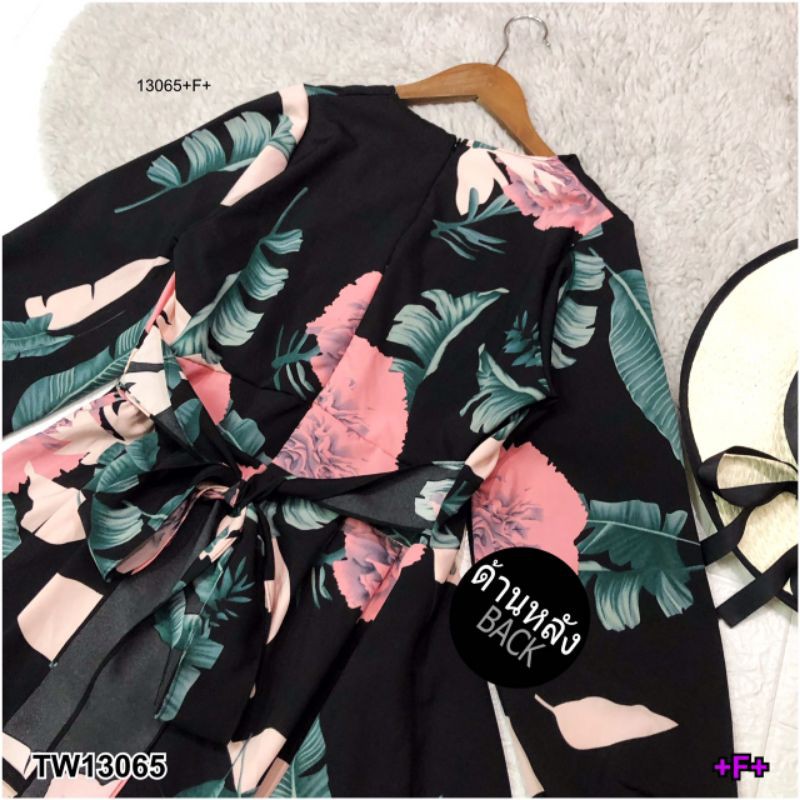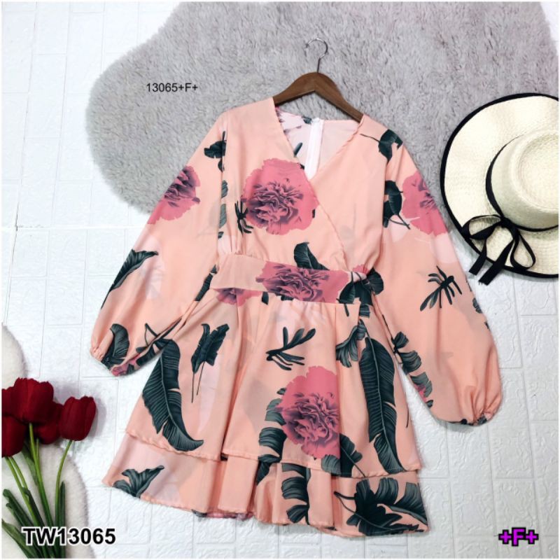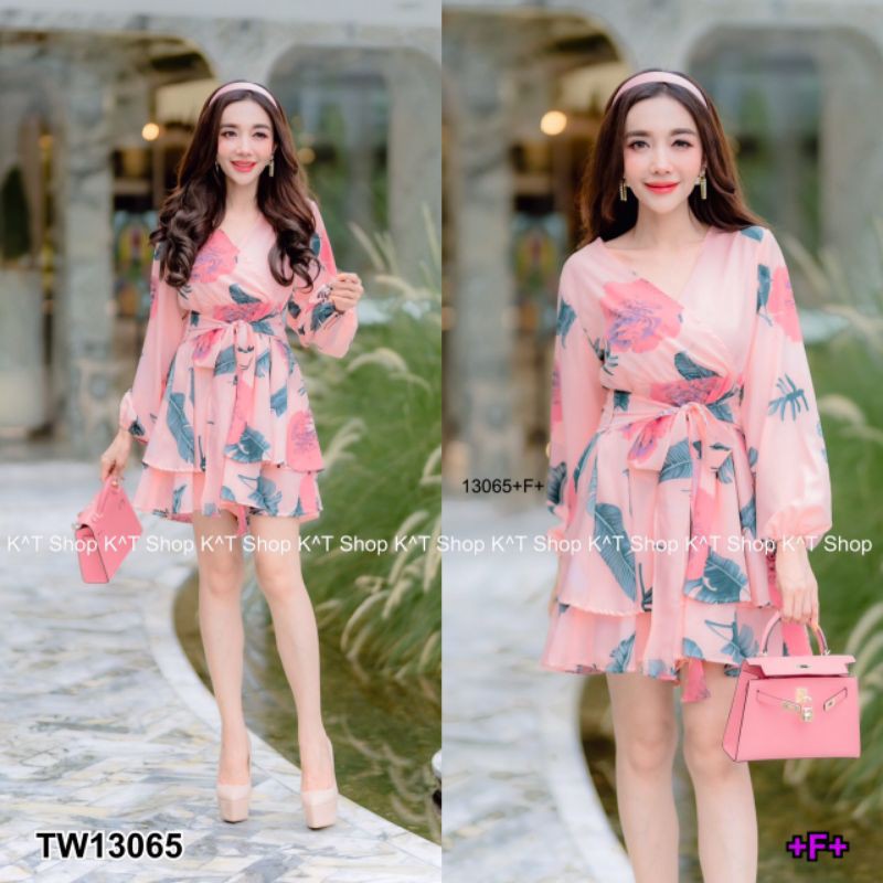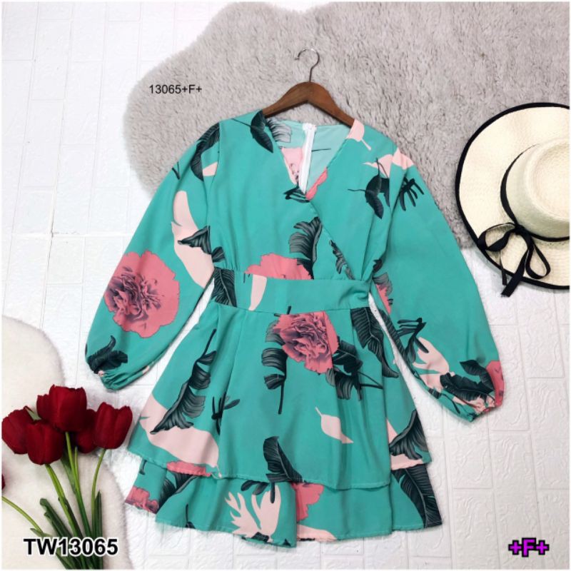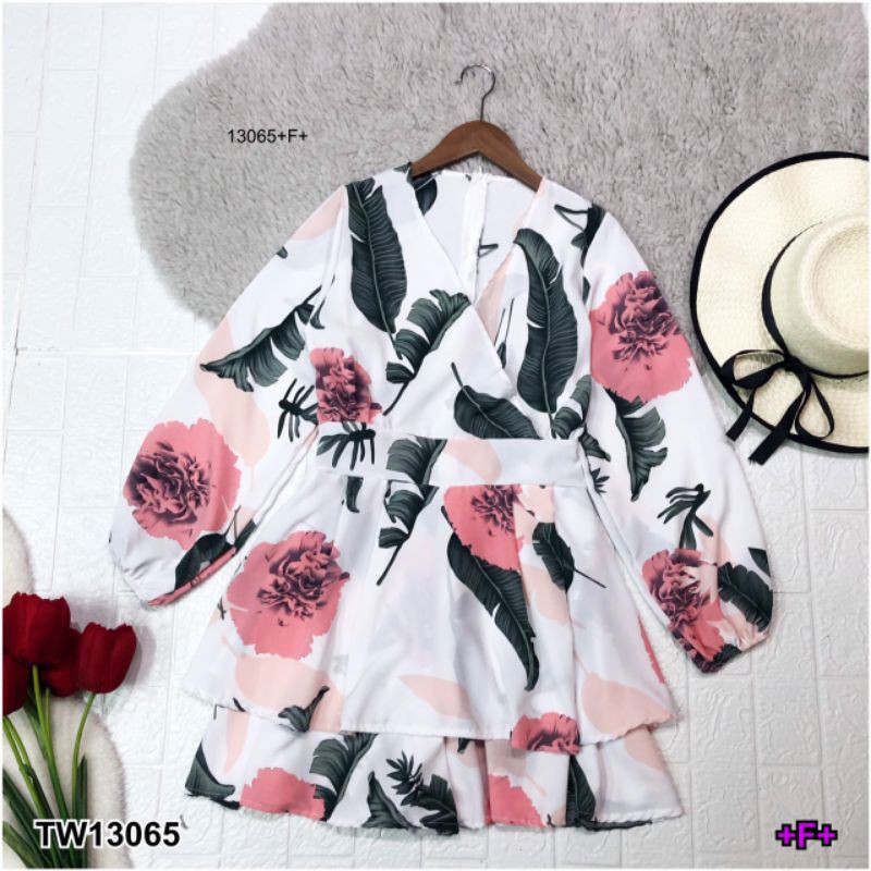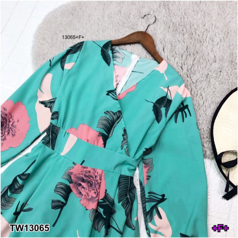 จั๊มสูทขาสั้น ทรงขาบาน ระบาย เหมือนกระโปรง พิมพ์ลายใบไม้ คอวีไขว้ แขนยาว ชุดเที่ยว เสื้อผ้าแฟชั่น 13065