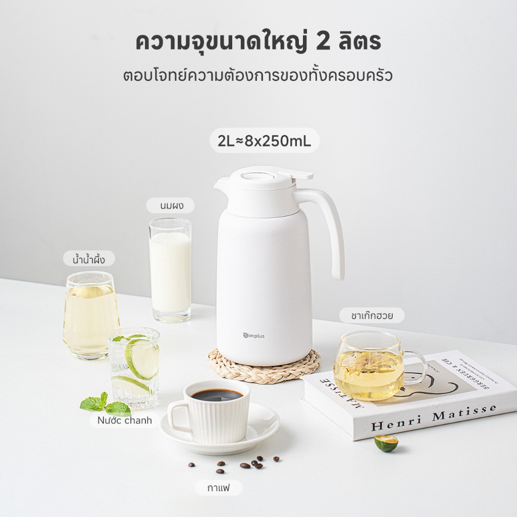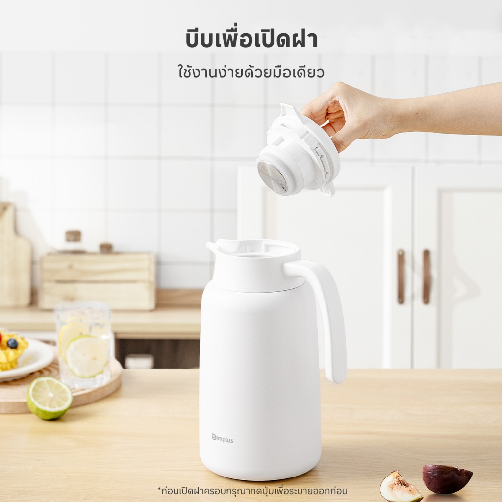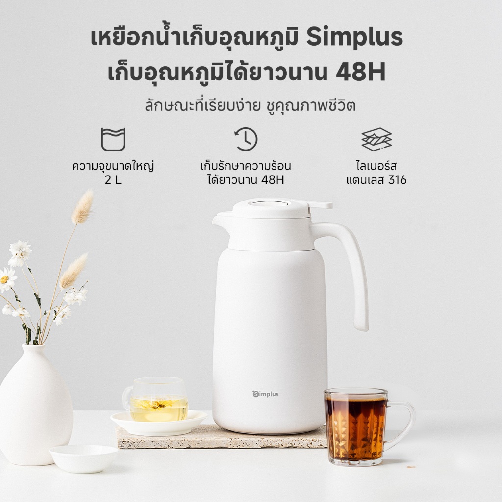 Simplus เหยือกน้ำเก็บอุณหภูมิ ซับในสแตนเลส ความจุ 2 ลิตร เก็บรักษาความร้อน 48 ชม. บีบเพื่อเปิดฝา BWHU001