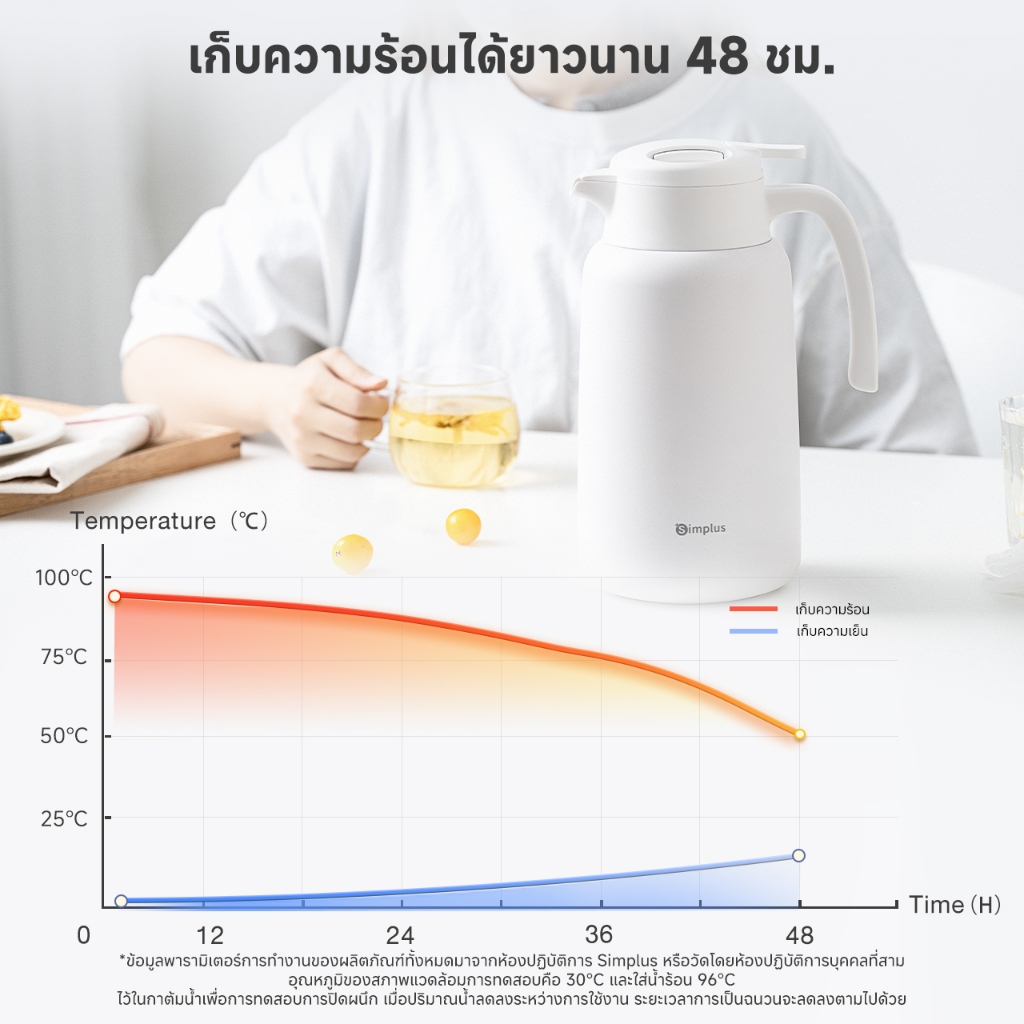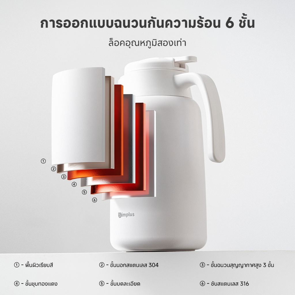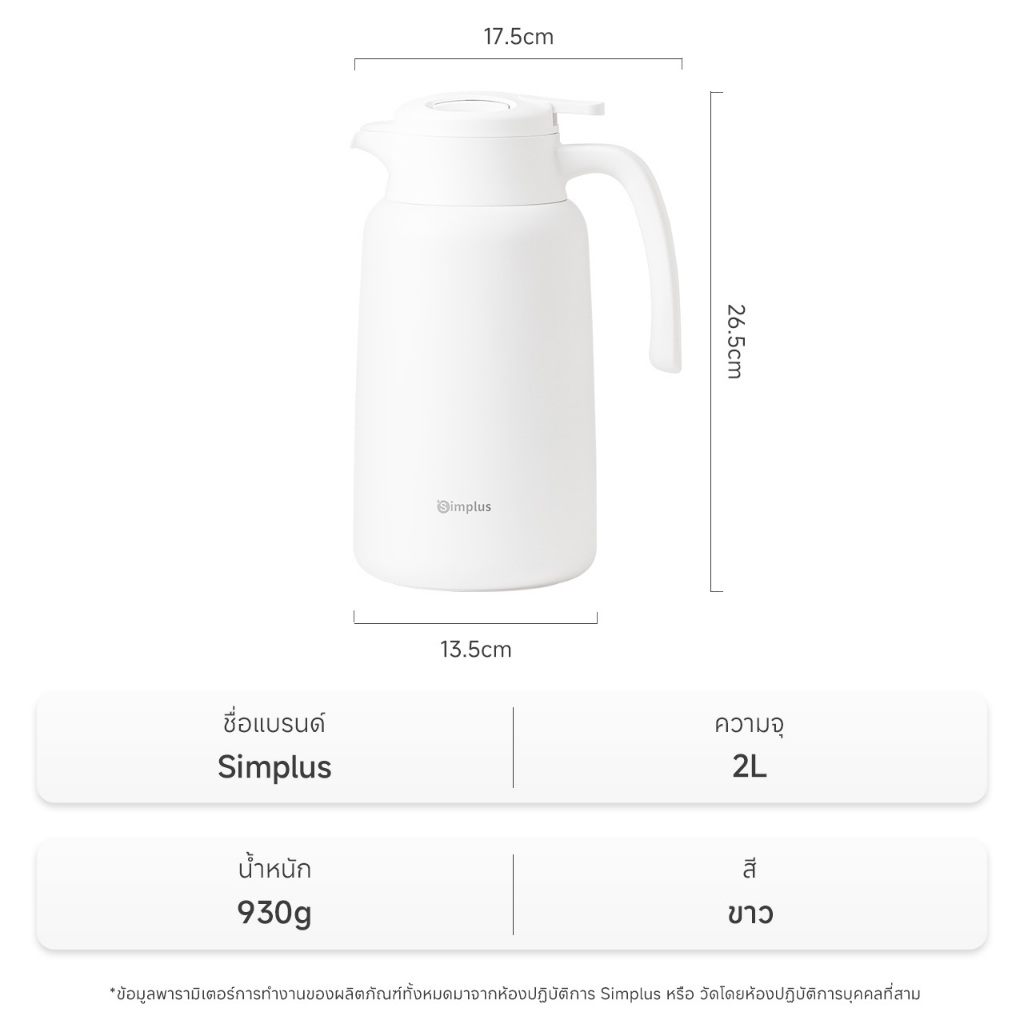 Simplus เหยือกน้ำเก็บอุณหภูมิ ซับในสแตนเลส ความจุ 2 ลิตร เก็บรักษาความร้อน 48 ชม. บีบเพื่อเปิดฝา BWHU001