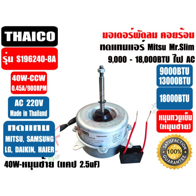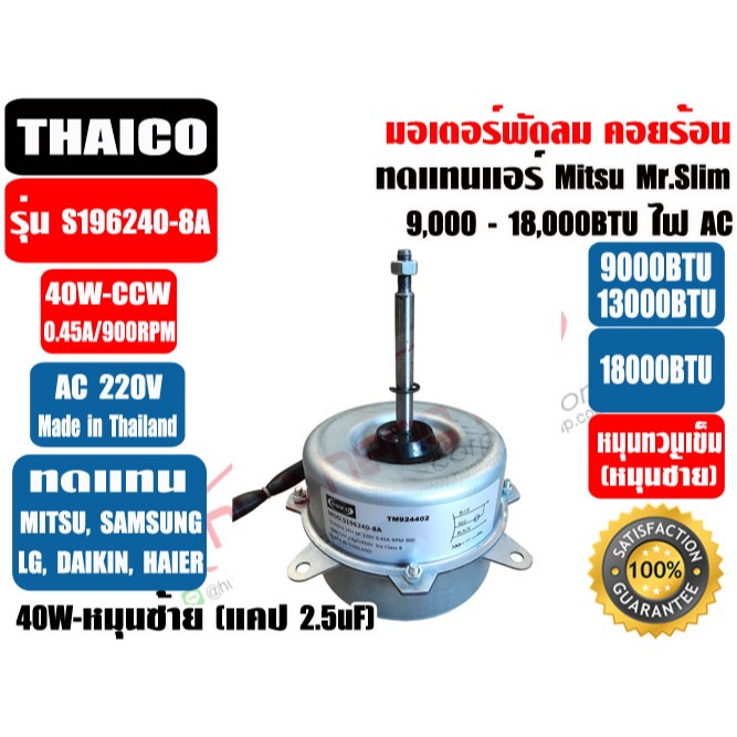 มอเตอร์พัดลม คอยล์ร้อน ทดแทนแอร์ได้หลากหลายยี่ห้อ THAICO ขนาด40W 220V หมุนขวา/ซ้าย และ 60W ขวา/ซ้าย
