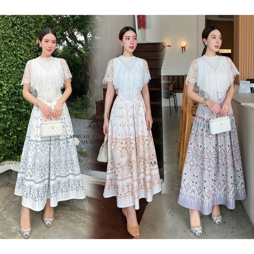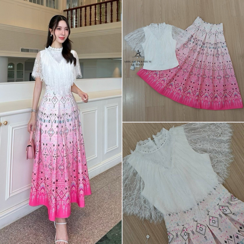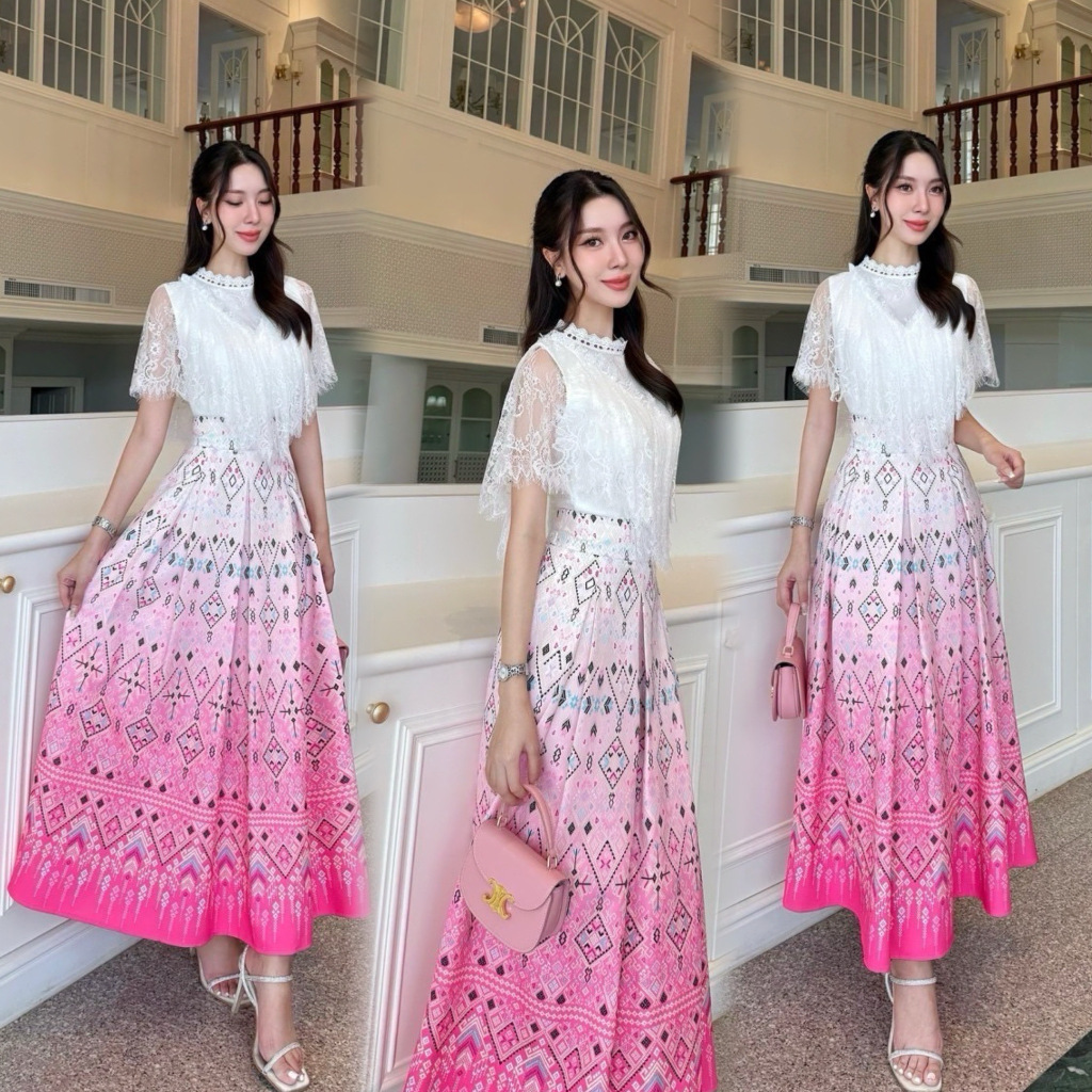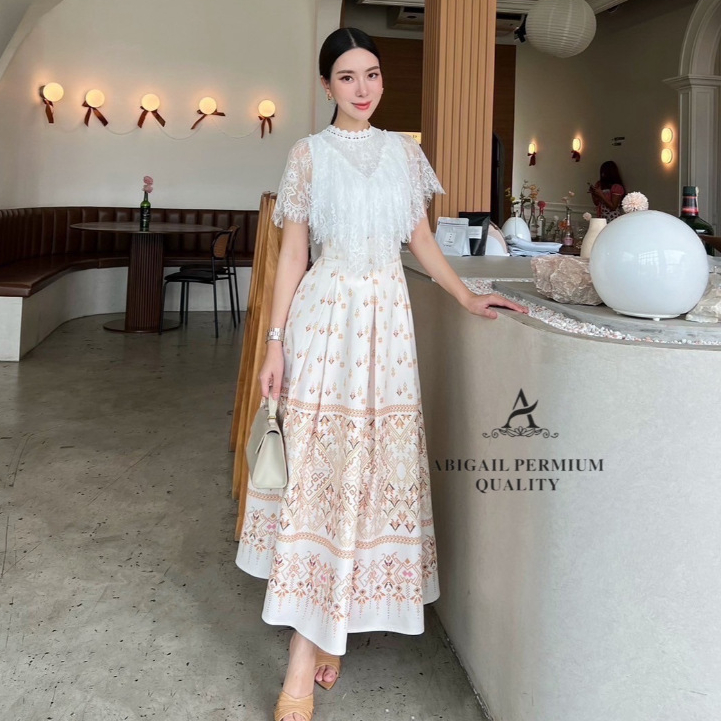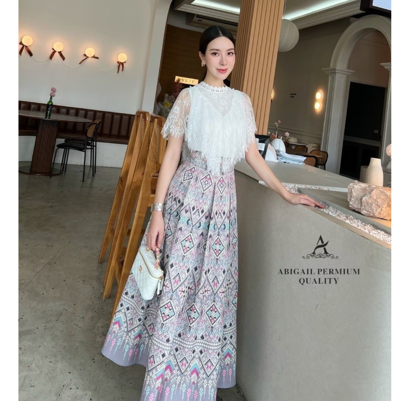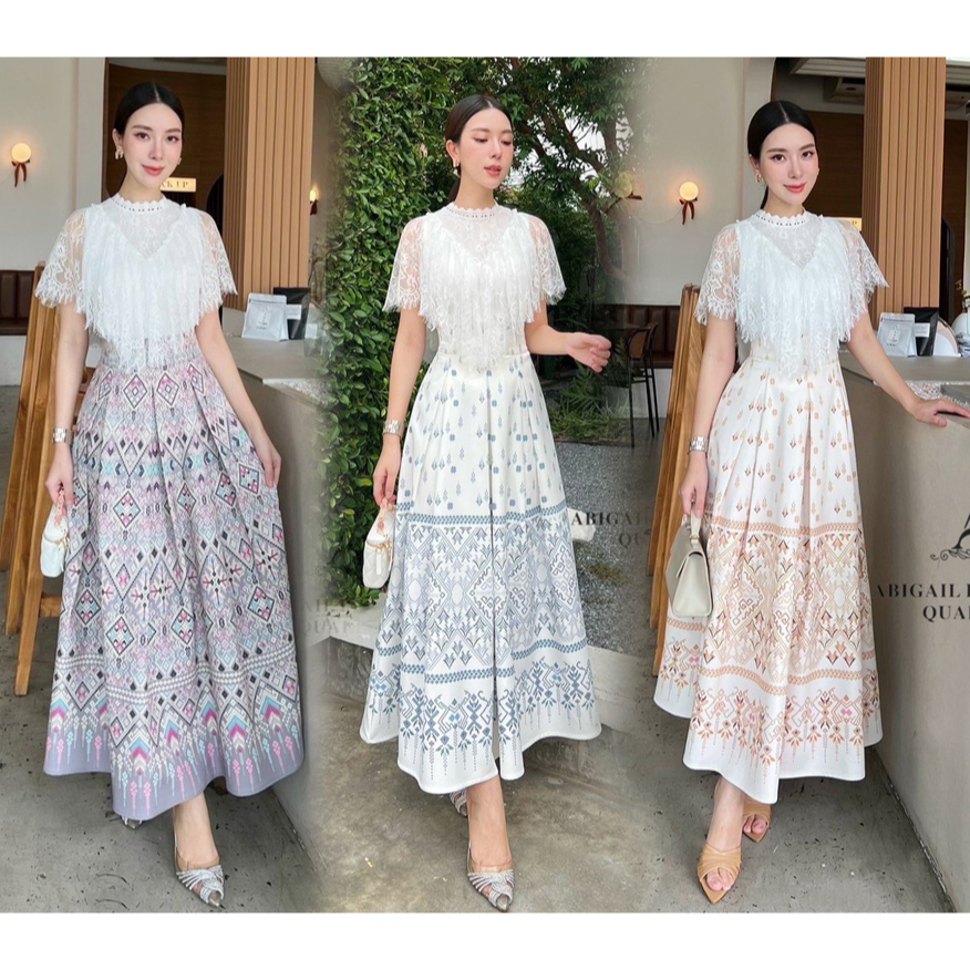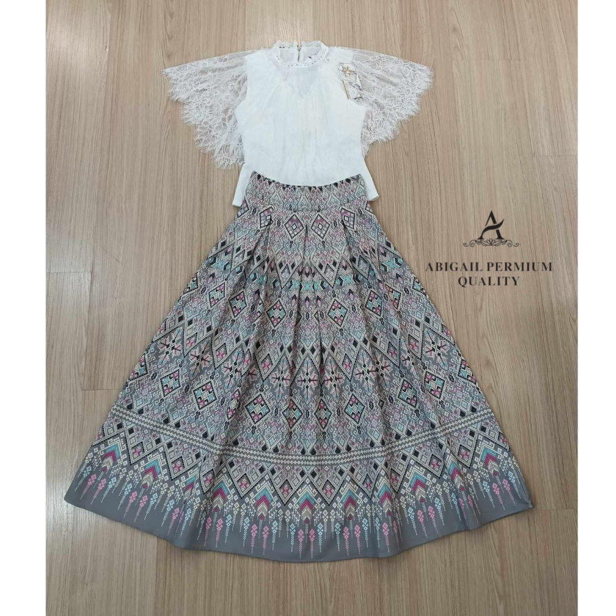 S-XL ชุดไทยประยุกต์ ใส่ทำบุญ เซท2 ชิ้น เสื้อลูกไม้ขาว+กระโปรงพิมพ์ลายไทย สีเทา ชมพู ครีมทอง #Abigail