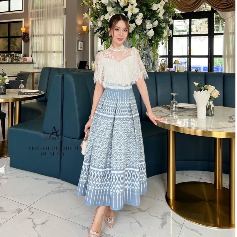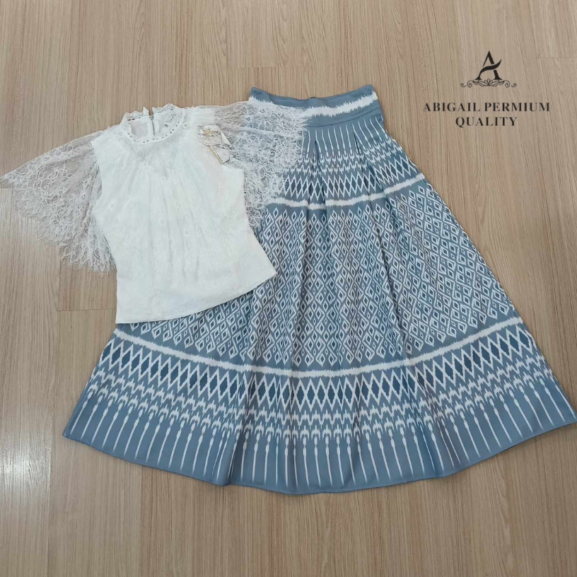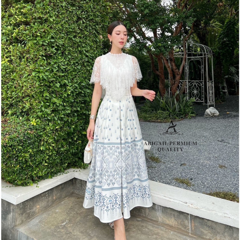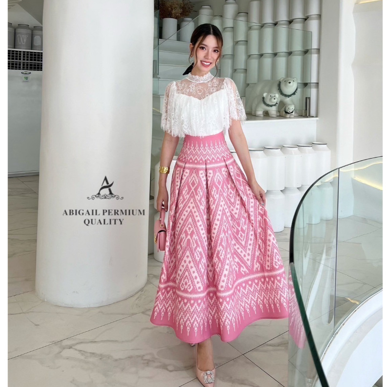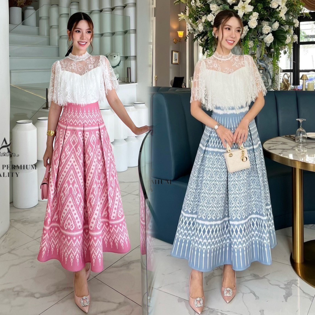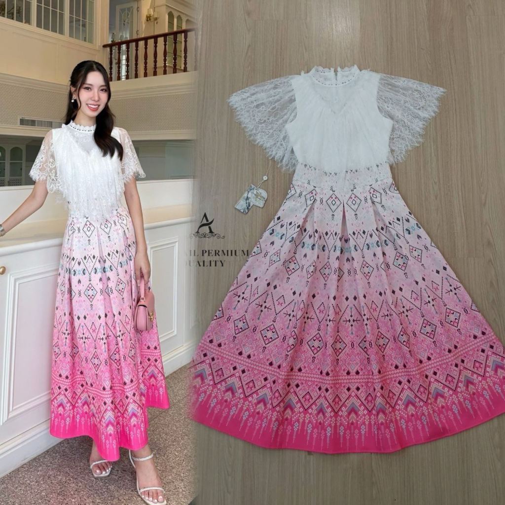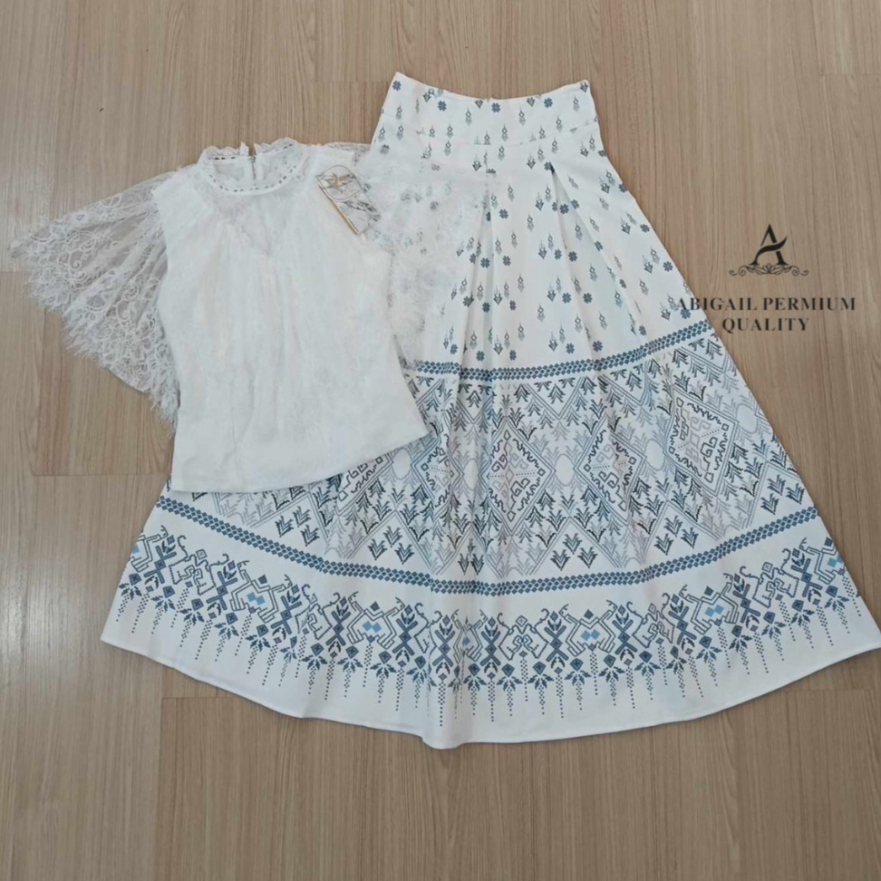 S-XL ชุดไทยประยุกต์ ใส่ทำบุญ เซท2 ชิ้น เสื้อลูกไม้ขาว+กระโปรงพิมพ์ลายไทย สีเทา ชมพู ครีมทอง #Abigail