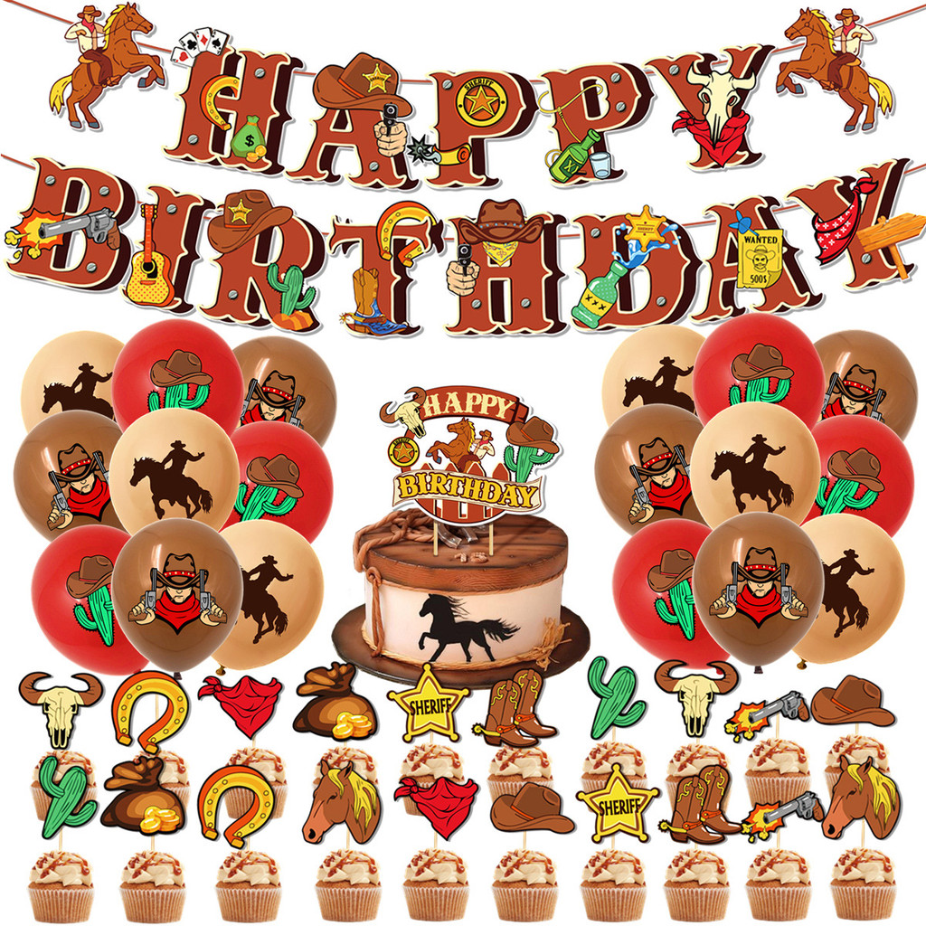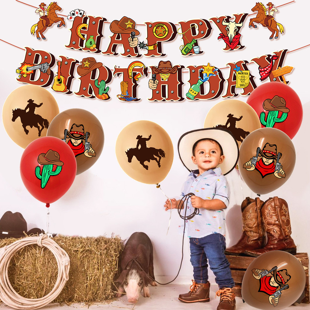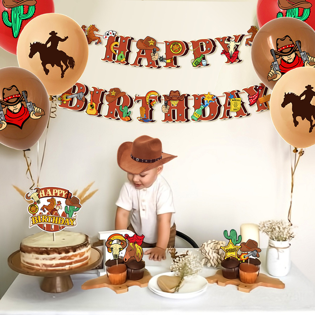 ธีมคาวบอยของตกแต่งงานเลี้ยงวันเกิดสําหรับเด็กแบนเนอร์เค้กท็อปเปอร์บอลลูนชุดอุปกรณ์