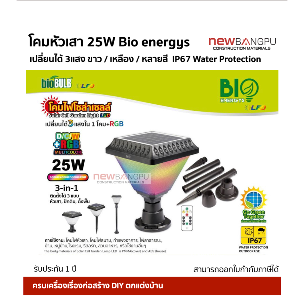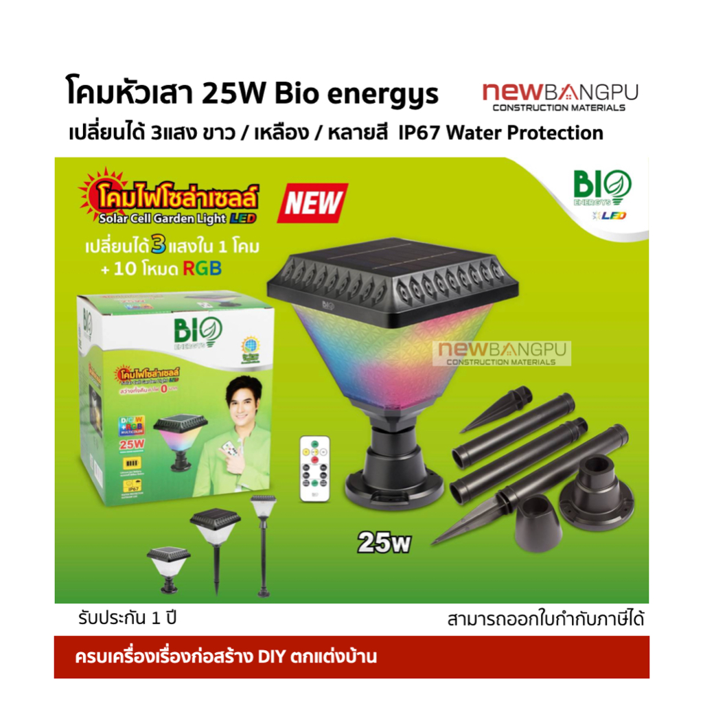 โคมหัวเสา 25W Solar Cell LED Bio Energys 3Color Change ปรับได้ 3แสง ขาว/สี/RGB มีรีโมท แบตลิเธียมไอออน ประหยัดค่าไฟ