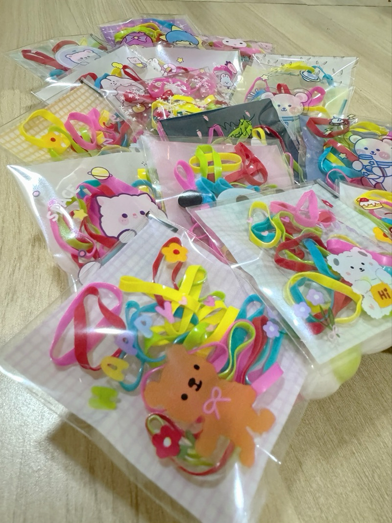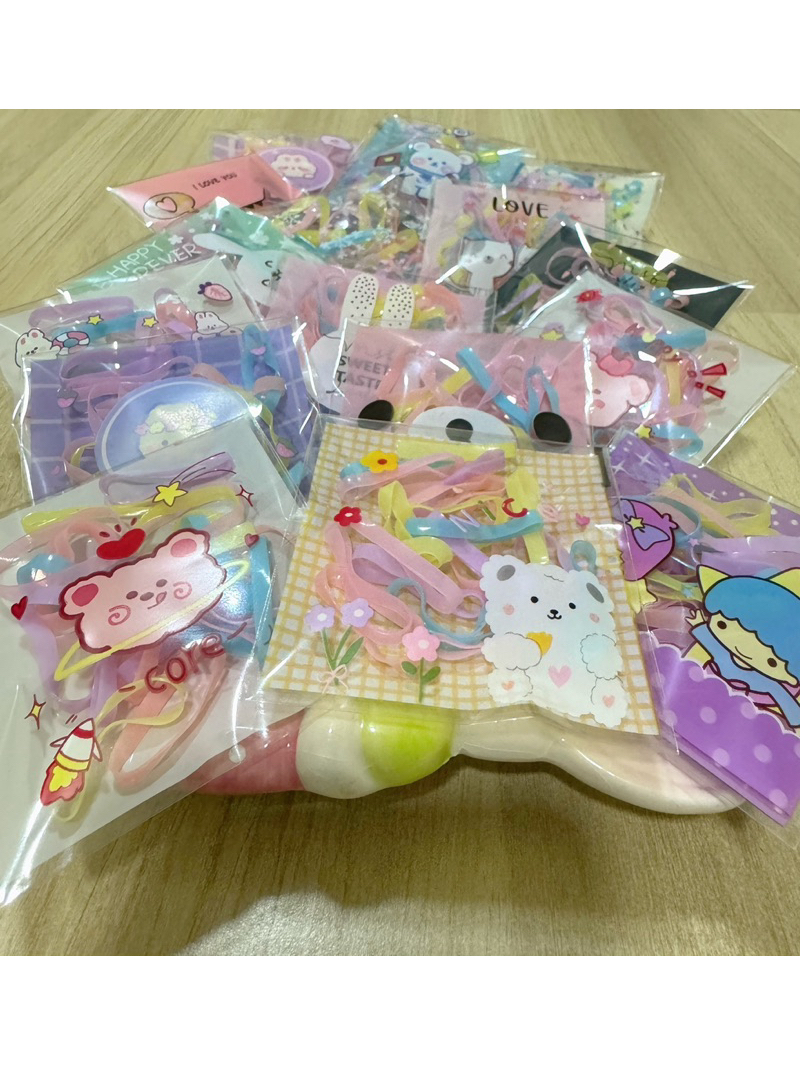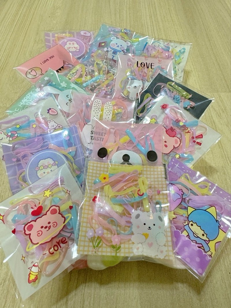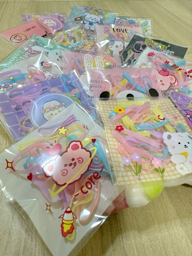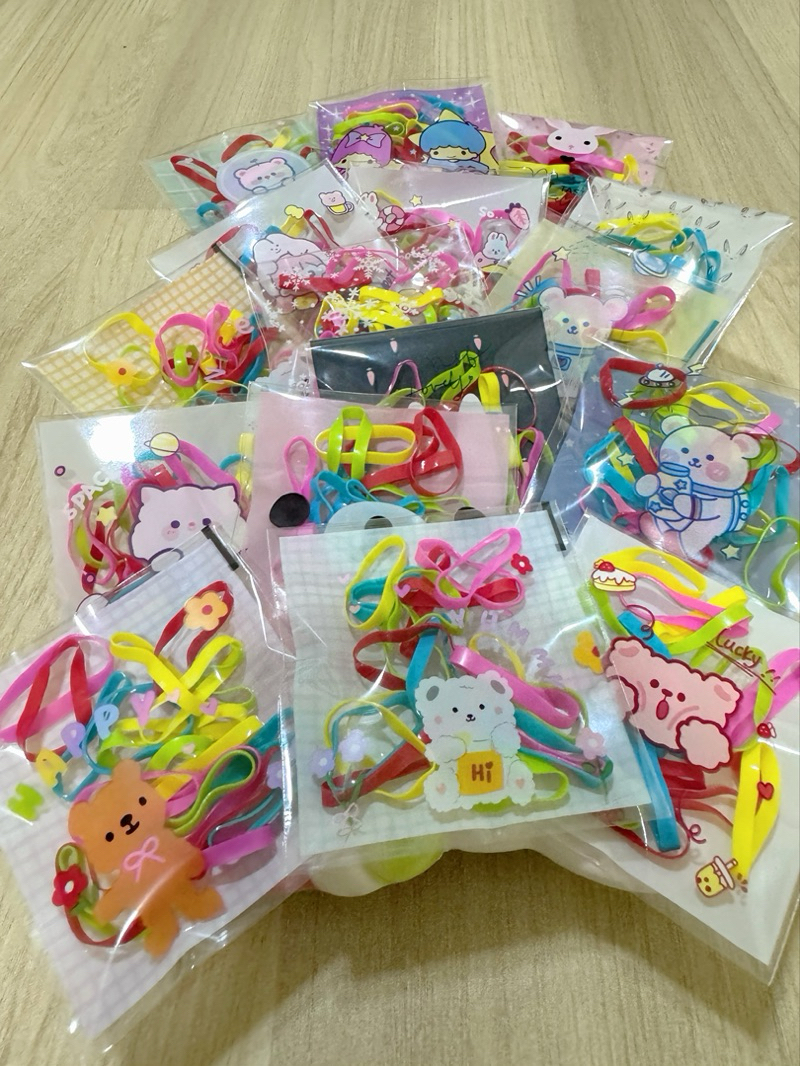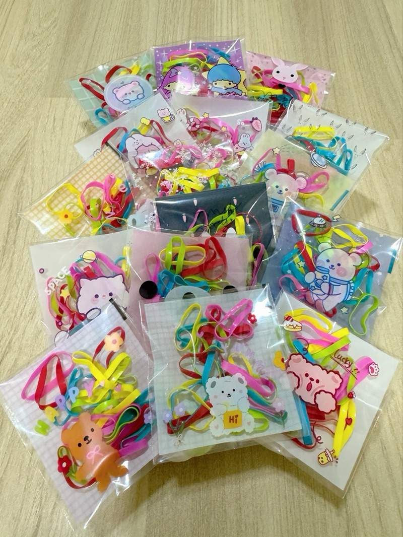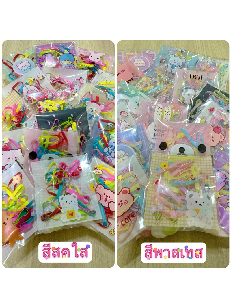 หนังยางรัดผม เส้นใหญ่ ห่อละ 20 เส้น บรรจุห่อลายการ์ตูน คละลาย ห่อละ 1 บาท