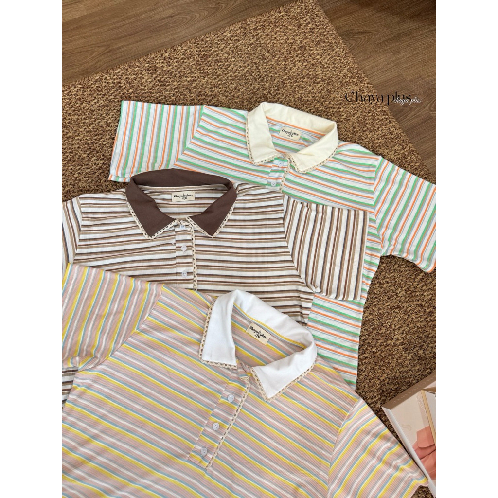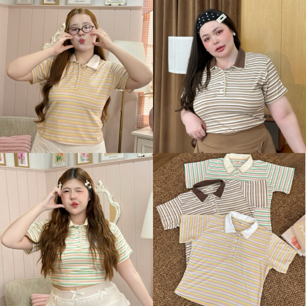 LD เสื้อคอปกโปโลแขนสั้น ลายริ้วโทนหวานๆ🍯🧁ผ้ายืดยูนิโคล่ ใส่สบาย ไซส์ใหญ่ สาวอวบ