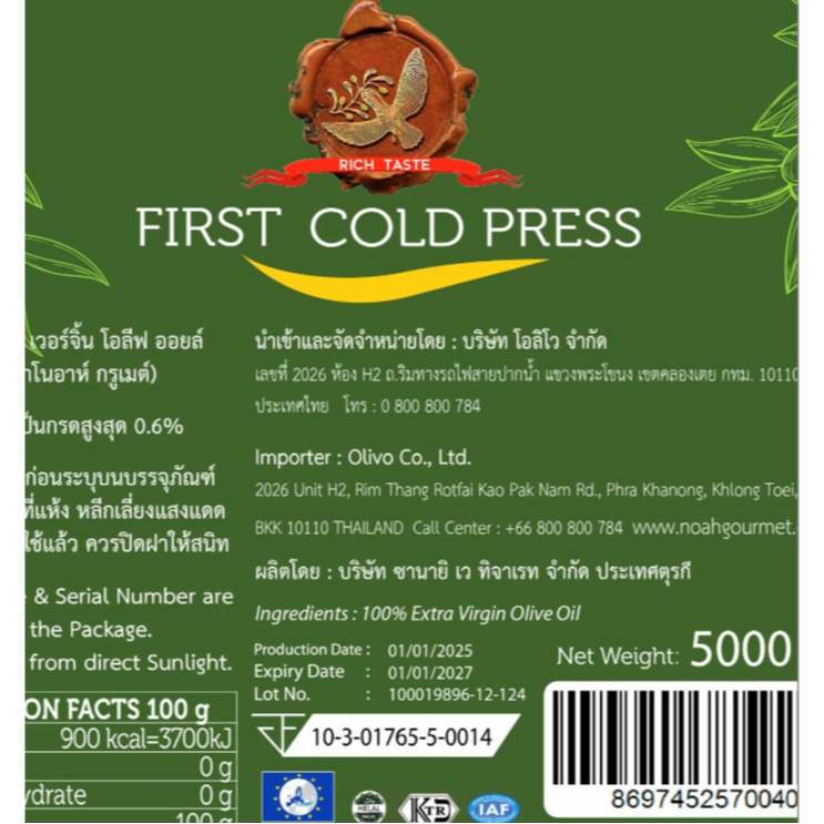 Extra Virgin Olive Oil 5-literน้ำมันมะกอก เอ็กซ์ตร้า เวอร์จิ้น 5 ลิตร Noah Gourmet Brand 1949 B