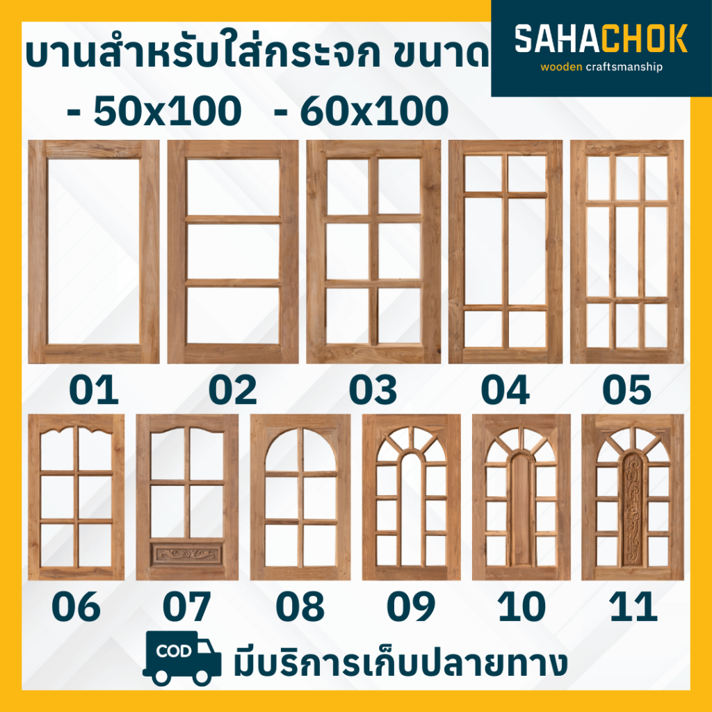 หน้าต่างไม้สักและไม้เนื้อแข็ง บานกระจก ขนาด 50-60*100 ซม.