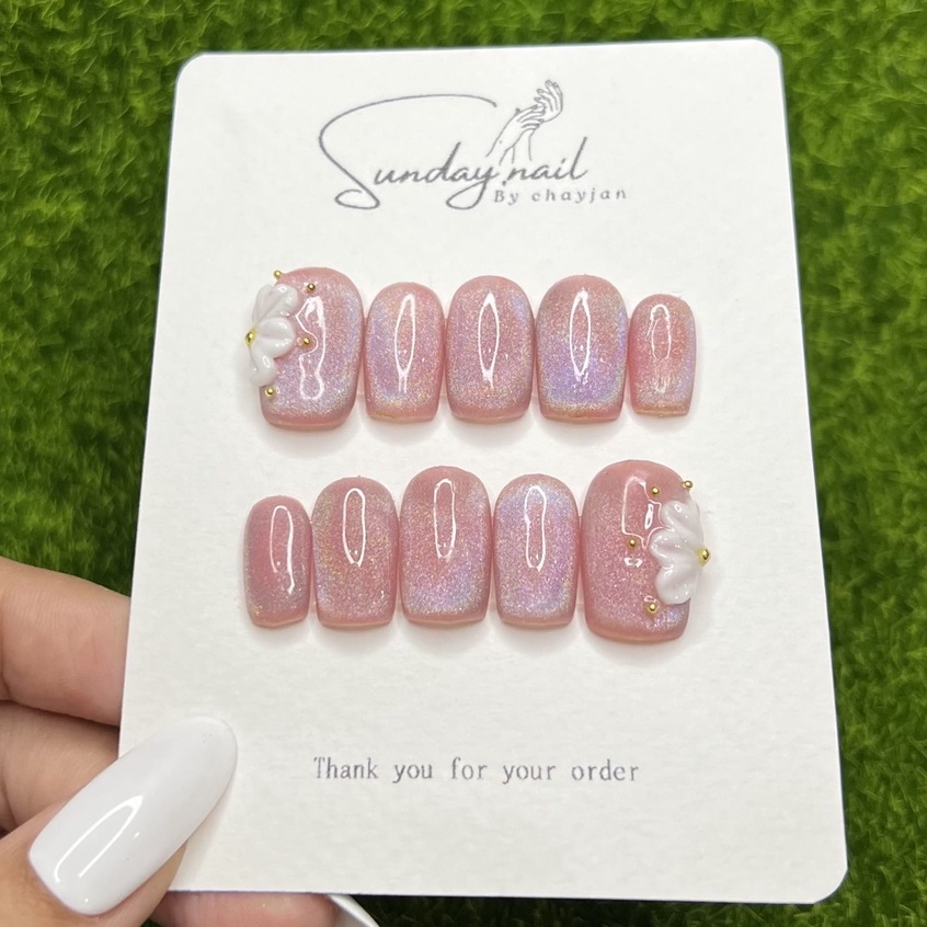 เล็บปลอมสำเร็จรูป สีเจลแท้ 100% สีชมพูโฮโลแกรม ปั้นดอก เล่นแสงสุด❗️ ฟรี กาว+ตะไบ+ไม้ดันหนัง+แผ่นAlcohol