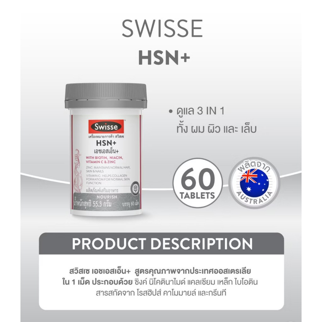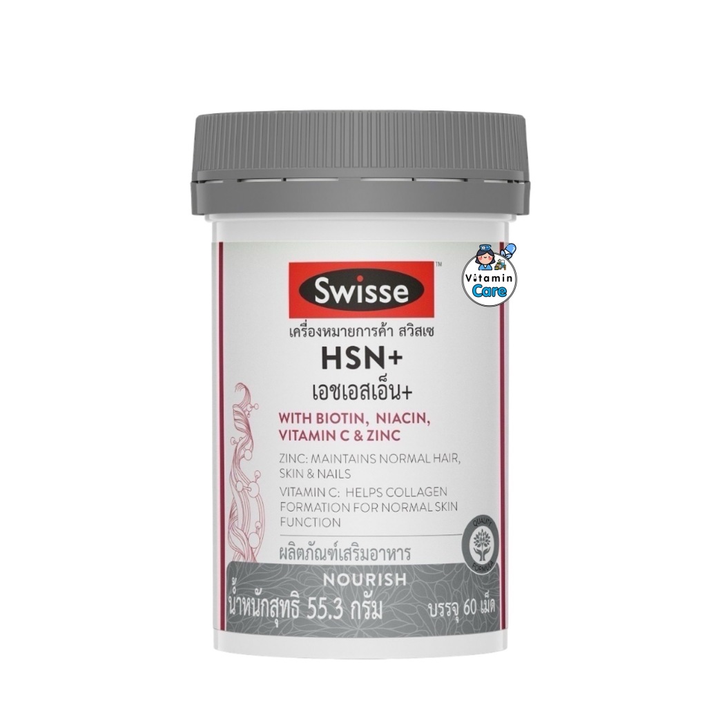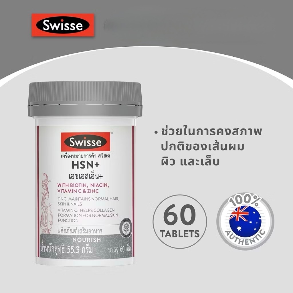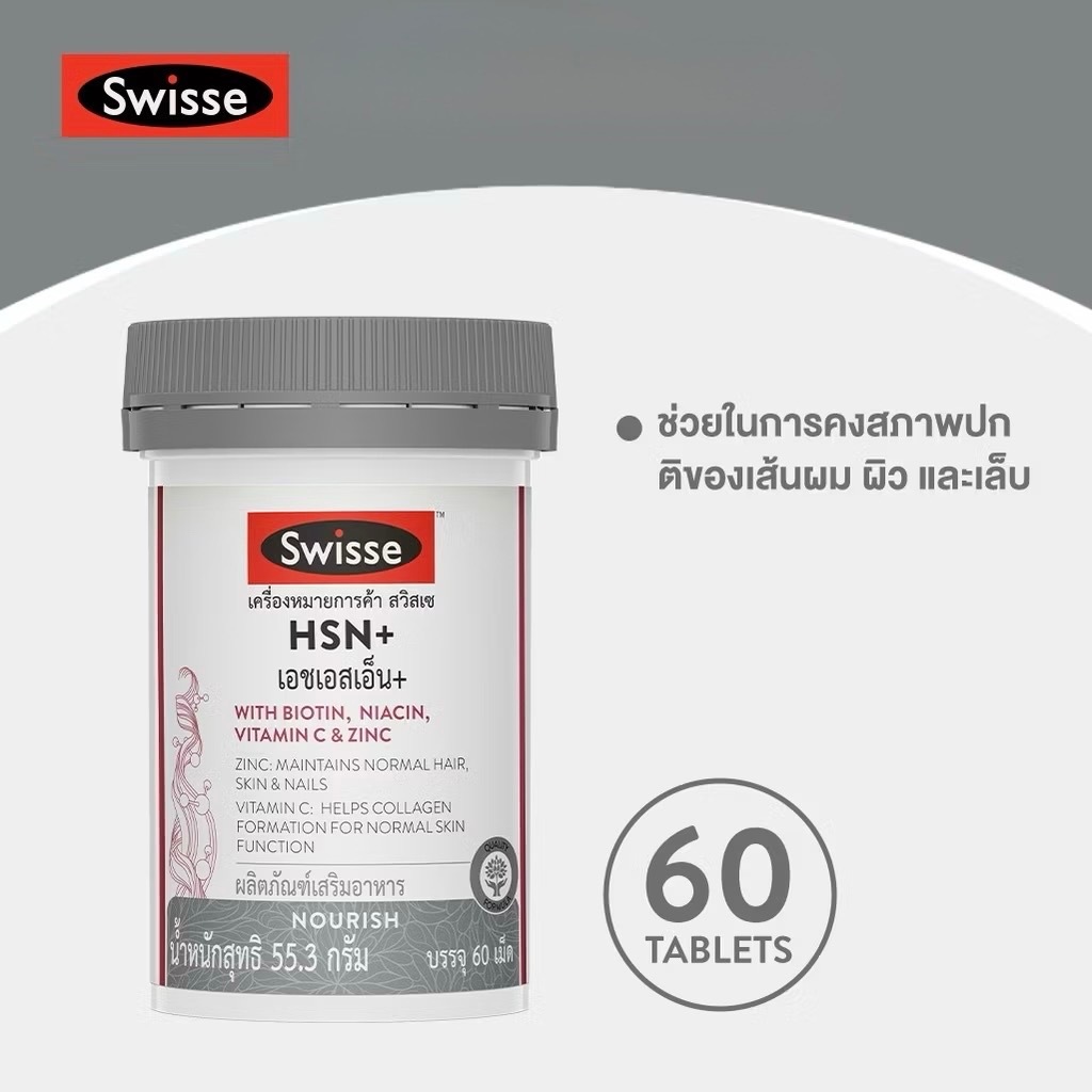 Exp.8/2027 (60 เม็ด) Swisse HSN+ with Biotin, Niacin, Vitamin C & Zinc เอช เอส เอ็น พลัส บำรุงเส้นผม ผิว และเล็บ