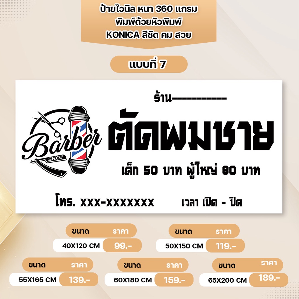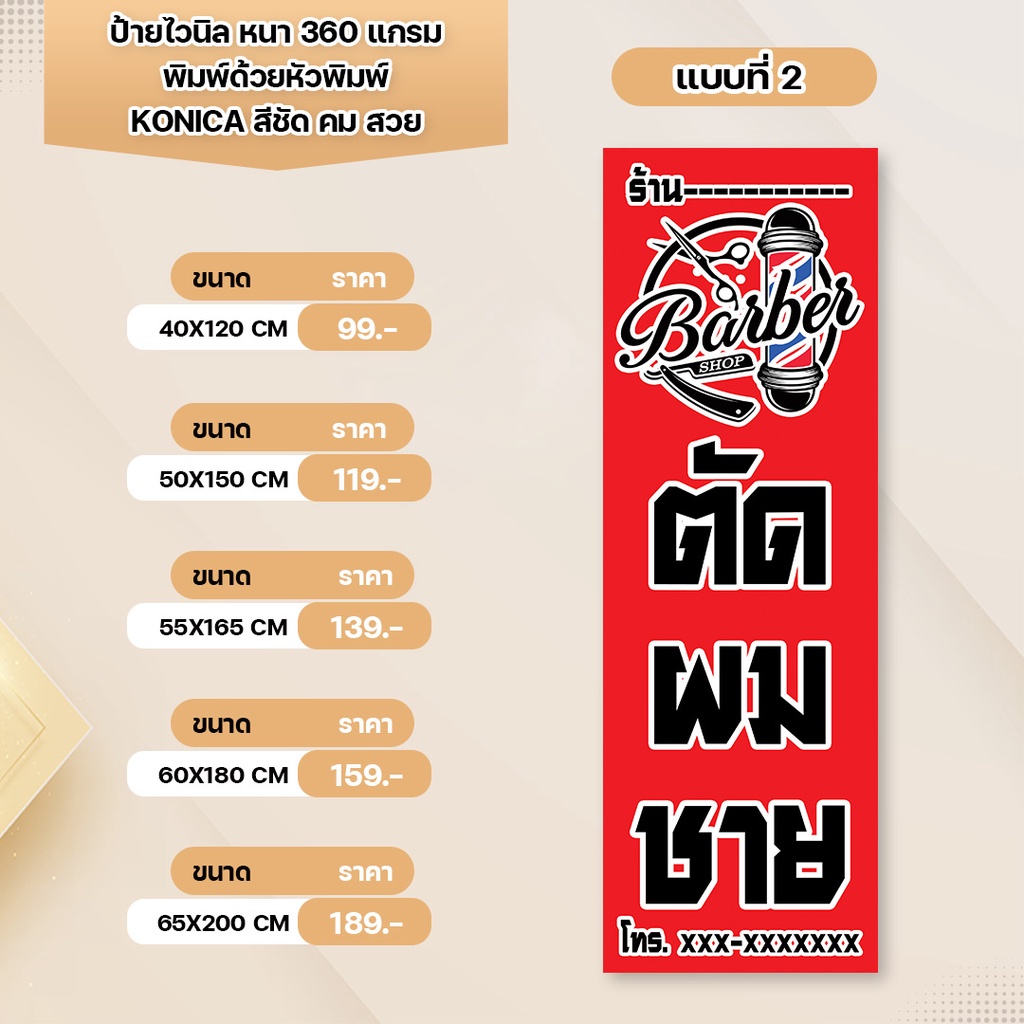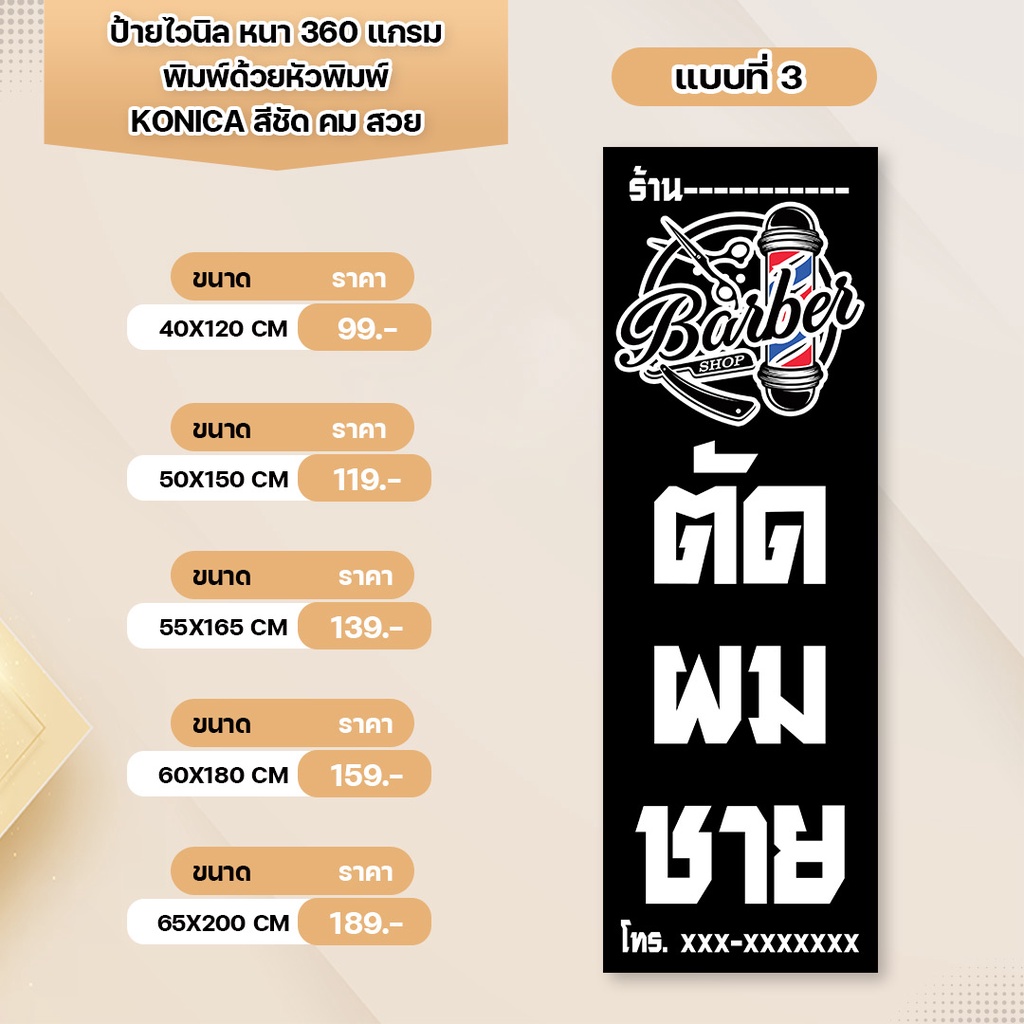 ป้ายไวนิล ร้านตัดผมชาย หนา 360 แกรม เจาะตาไก่ พิมพ์ด้วยหัวพิมพ์คุณภาพสูง สีสวยคมชัด ทนทาน ทนแดดทนฝน