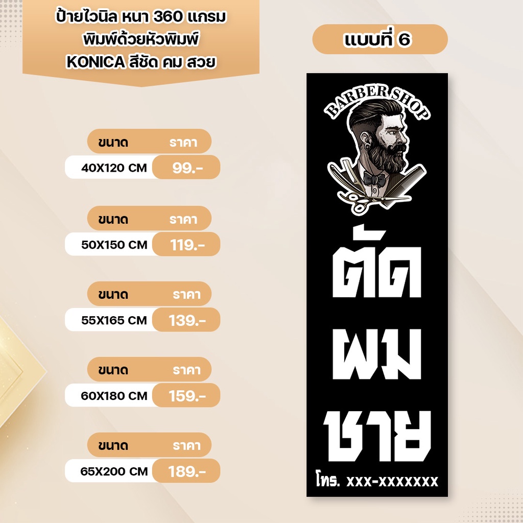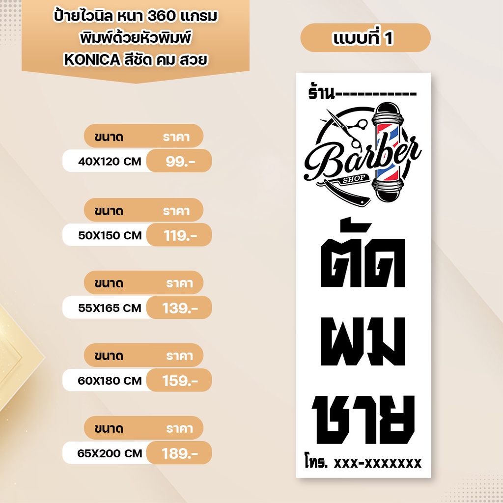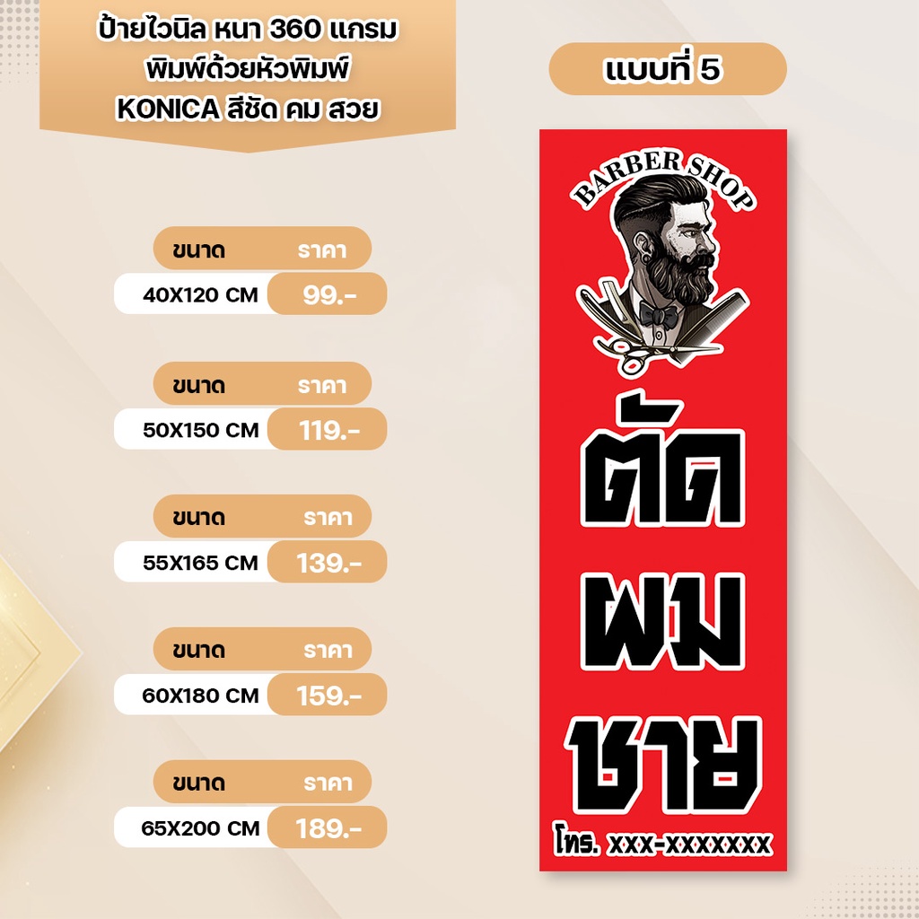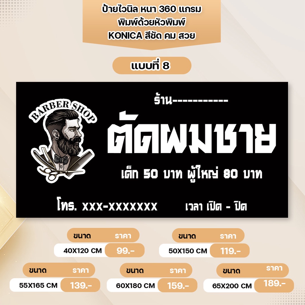 ป้ายไวนิล ร้านตัดผมชาย หนา 360 แกรม เจาะตาไก่ พิมพ์ด้วยหัวพิมพ์คุณภาพสูง สีสวยคมชัด ทนทาน ทนแดดทนฝน