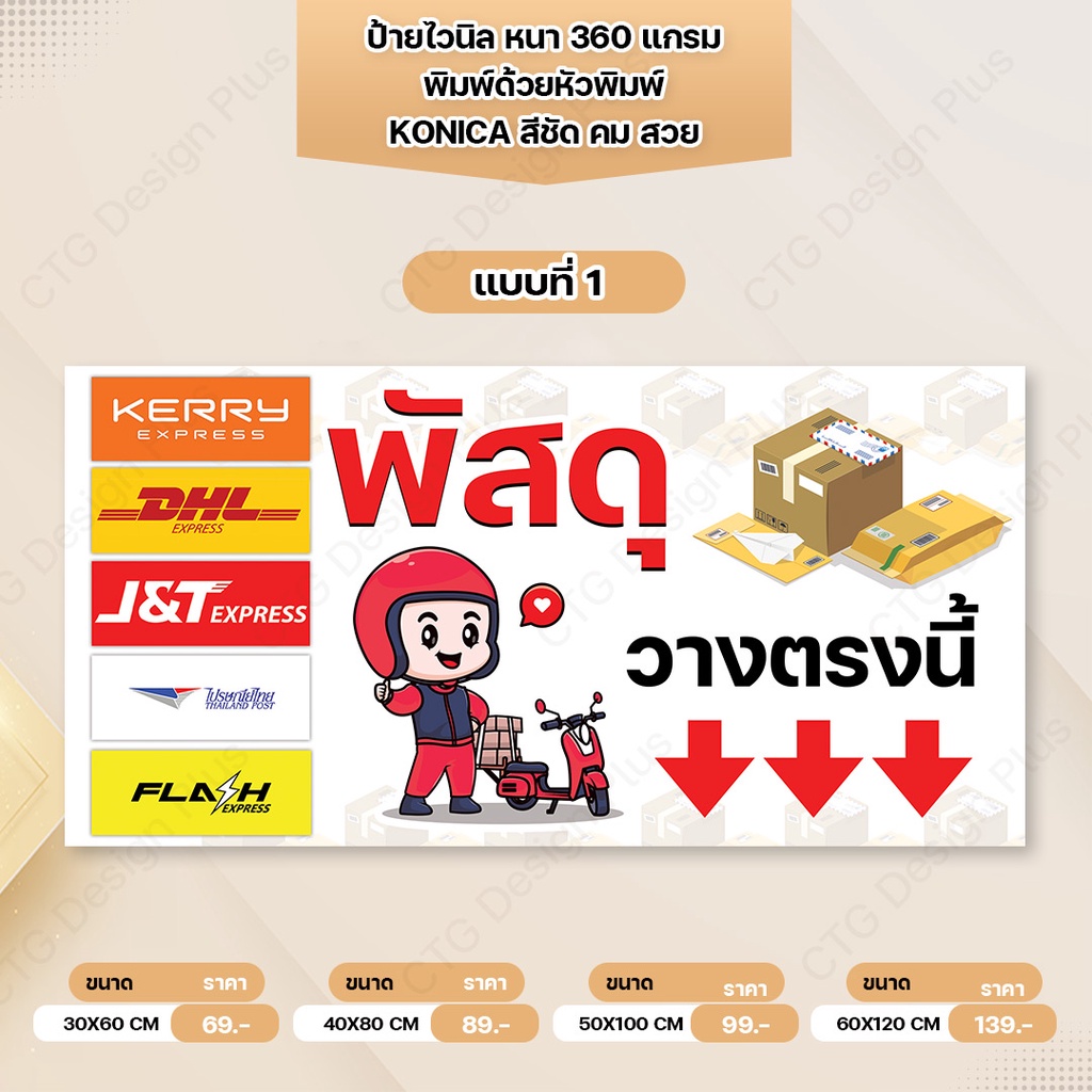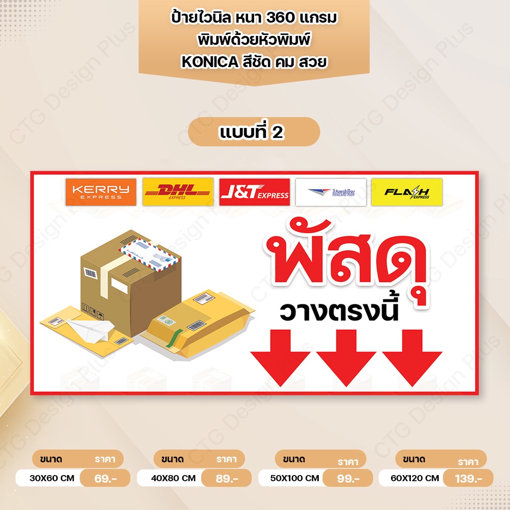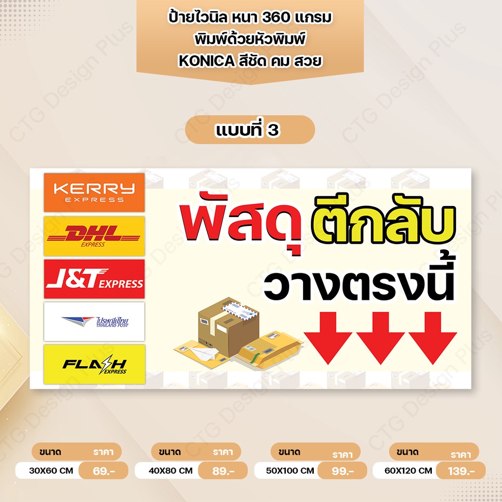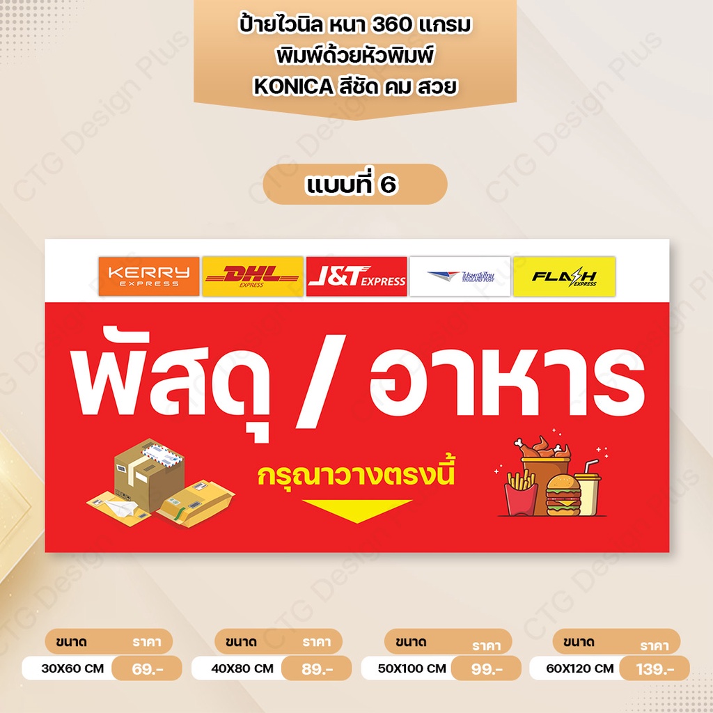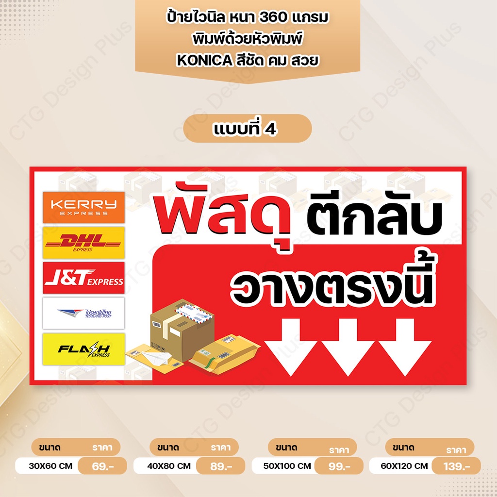 ป้ายไวนิล"พัสดุ,พัสดุตีกลับ,อาหาร วางตรงนี้" พับขอบเจาะตาไก่ฟรี หนา 360 แกรม ทนทาน สีสด สวยคมชัด