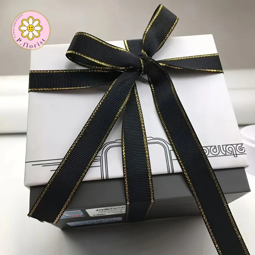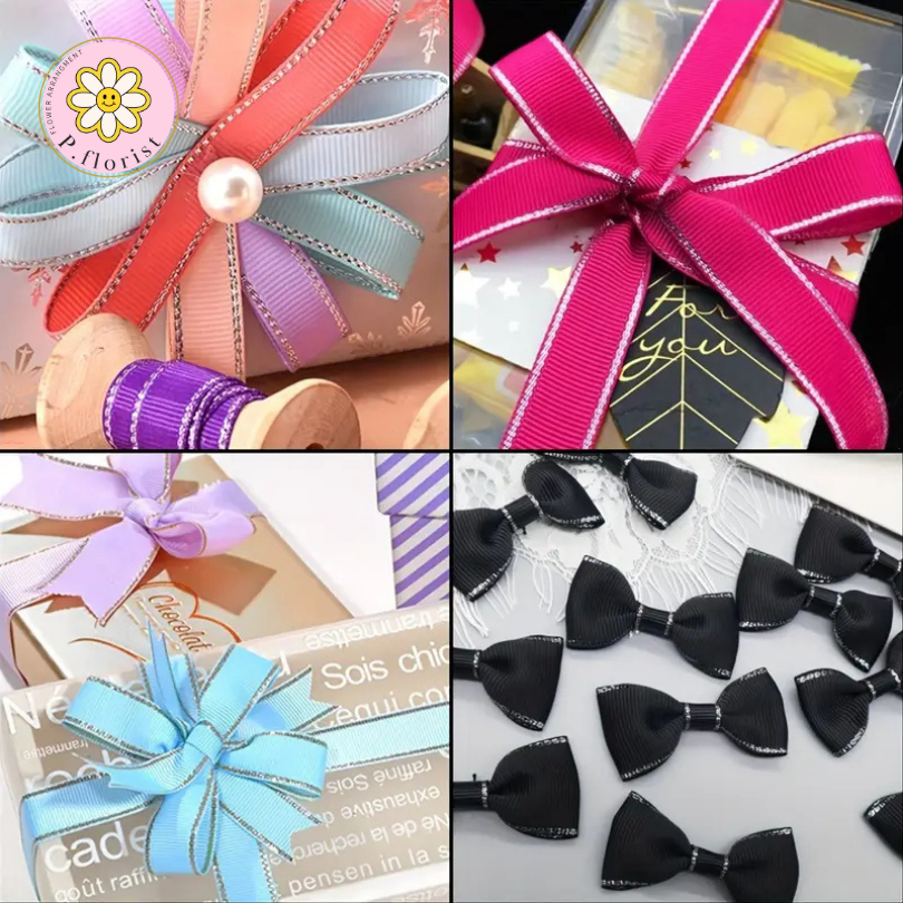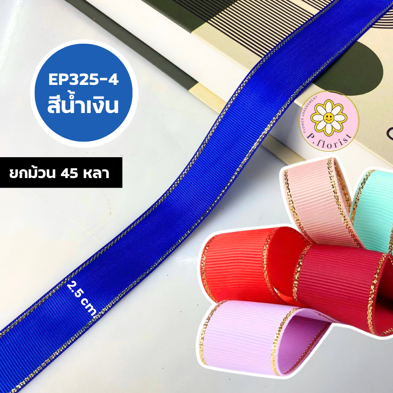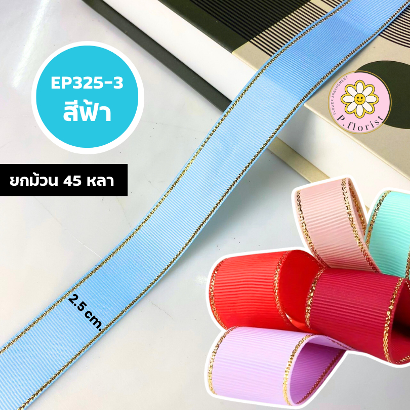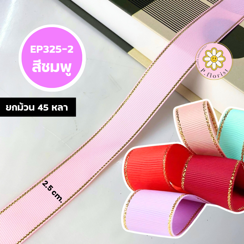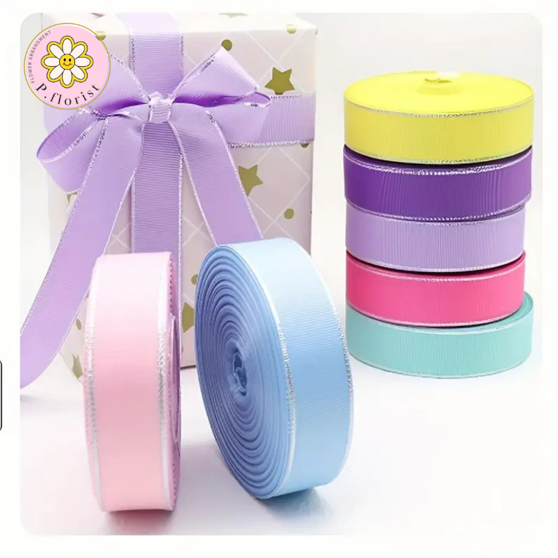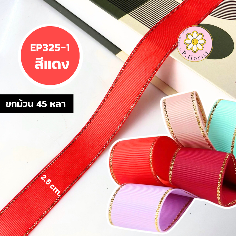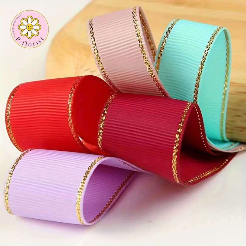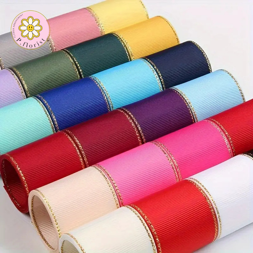 ริบบิ้นผ้ากรอสเกรน แบ่งตัดหลา สีพื้นขอบผ้าริมทอง หน้ากว้าง 2.5 ซม. ยาว45-50หลา เนื้อหนา คุณภาพดี โบว์ผูกของขวัญปีใหม่