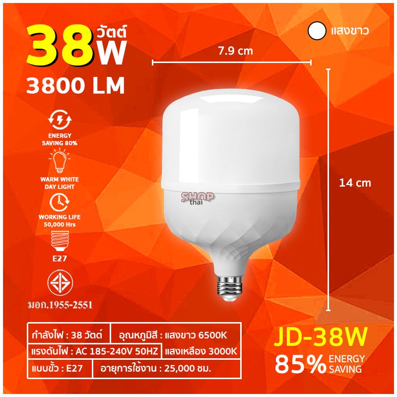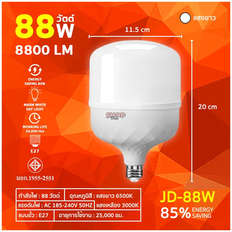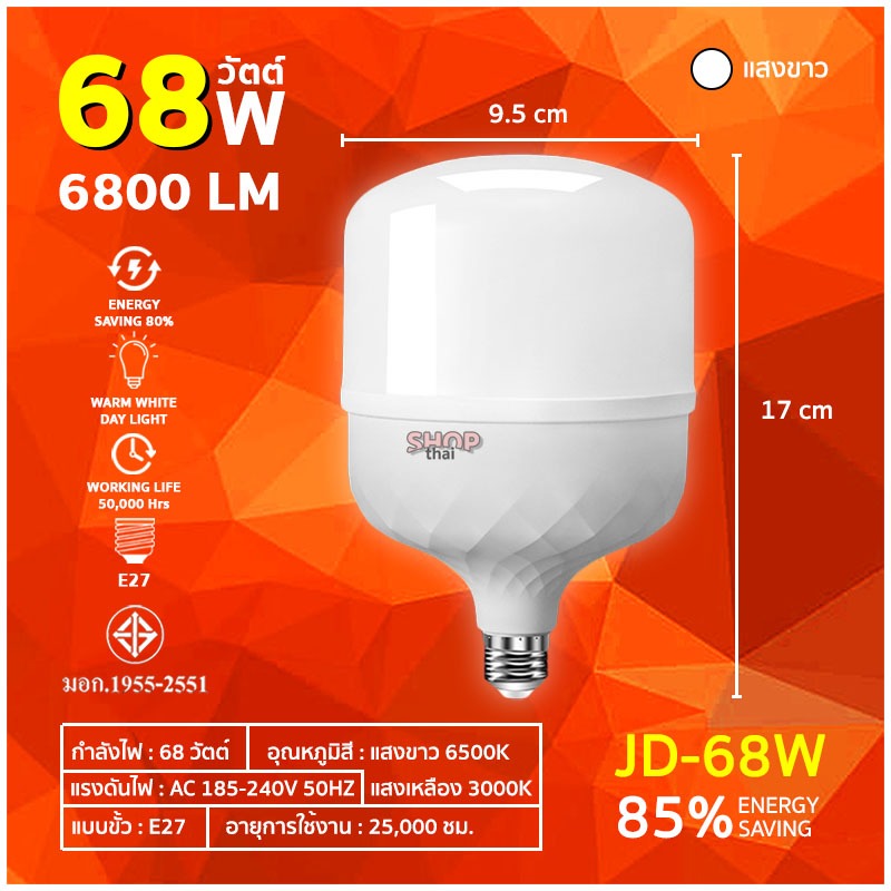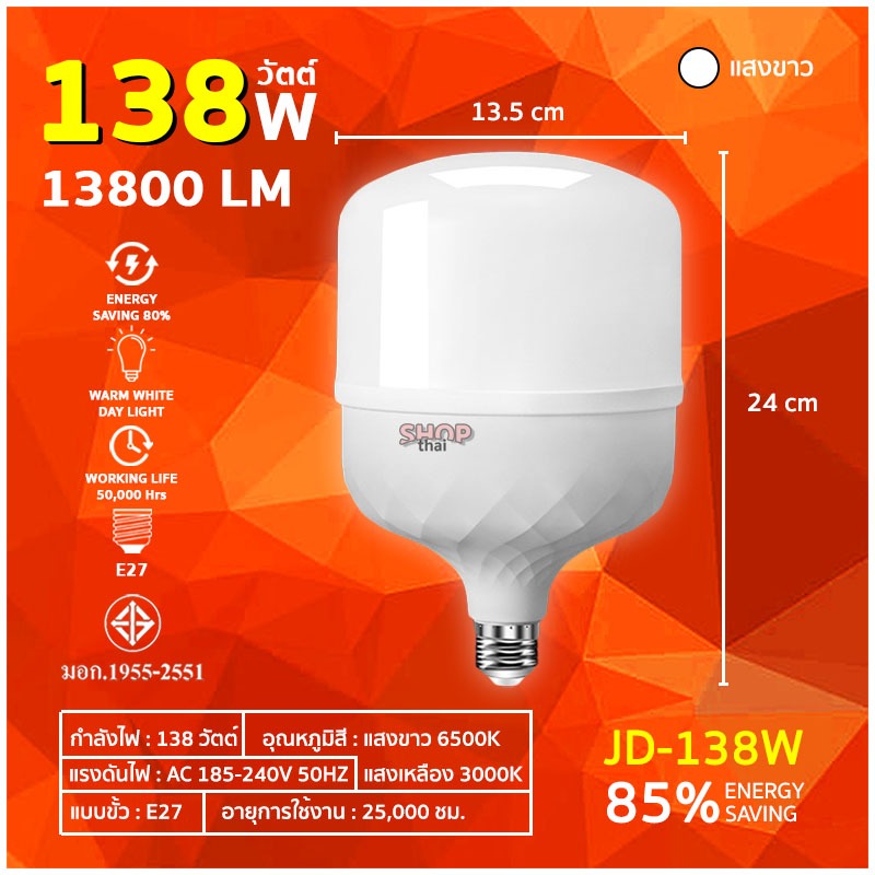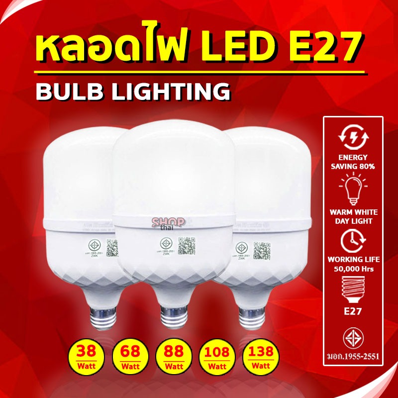 หลอดไฟ LED BULB ขั้ว E27 หลอดไฟประหยัดพลังงาน 38/68/88/108/138 วัตต์ ทรงกระบอก (แสงไฟสีขาว)