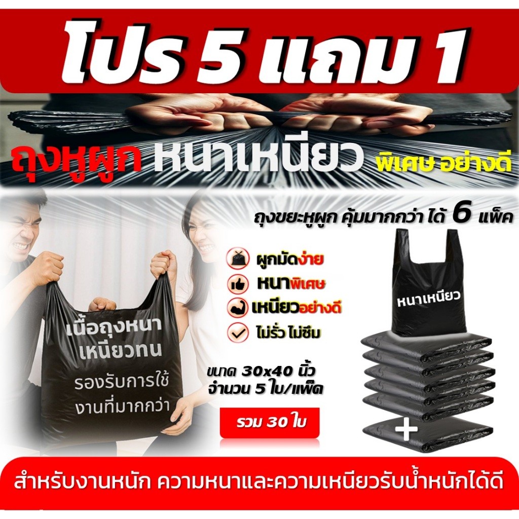 ถุงขยะ5แถม1(ได้6แพ็ค) ถุงขยะหูผูก แบ บหนาเหนียว สำหรับงานหนัก ใช้ง่าย สะดวกผูกมัดทิ้งได้ ไม่เลอะมือ