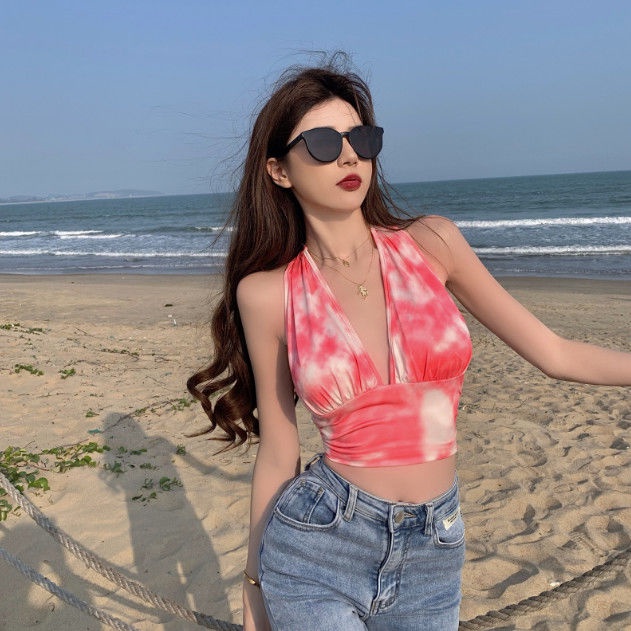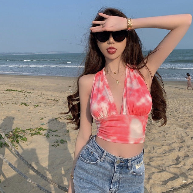 Cckoss พร้อมส่ง สลิงท๊อป ฤดูร้อน ผู้หญิงเซ็กซี่ มัดย้อมเสื้อกั๊ก ผูกหลังคล้องคอ สาวฮอต เซ็กซี่ ไปทะเลกระโปรง เปลือยหลัง