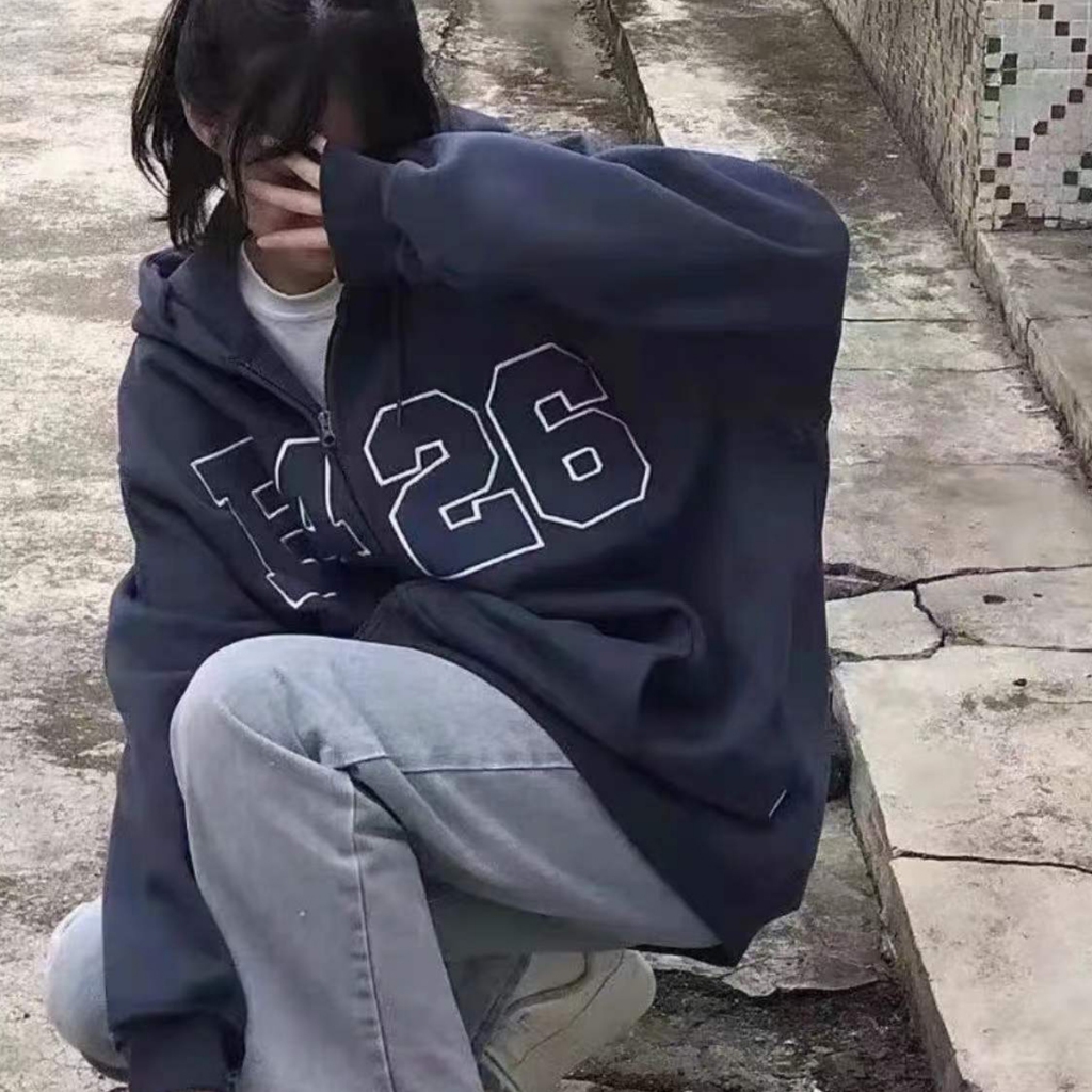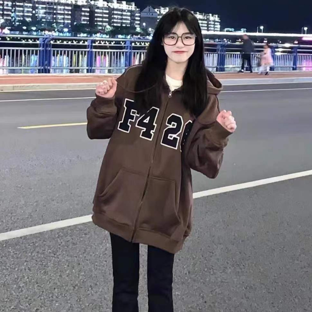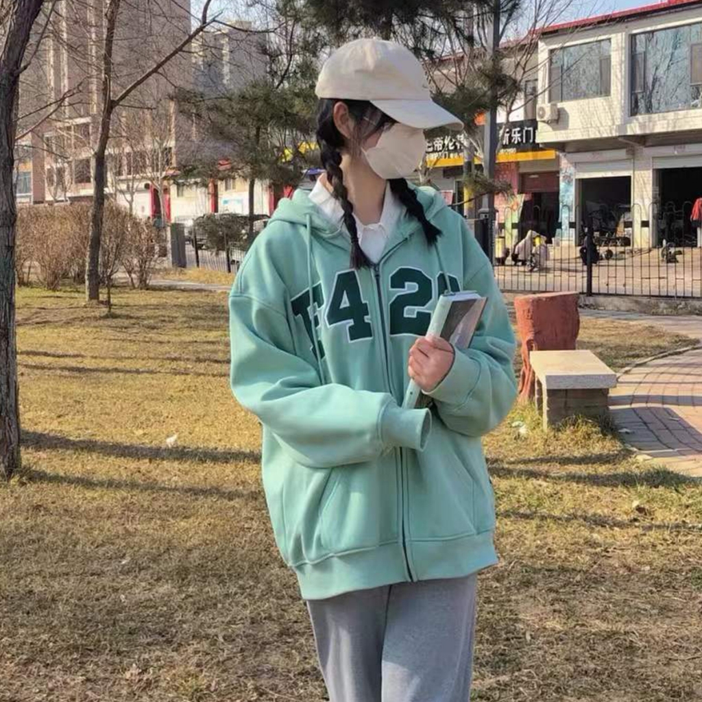 เสื้อแจ็กเก็ตกันหนาว มีฮู้ด แต่งซ ิป พิมพ์ลายตัวอักษร ทรงหลวม