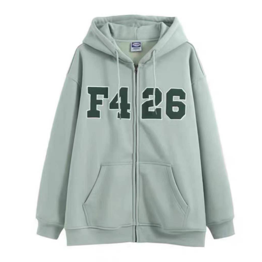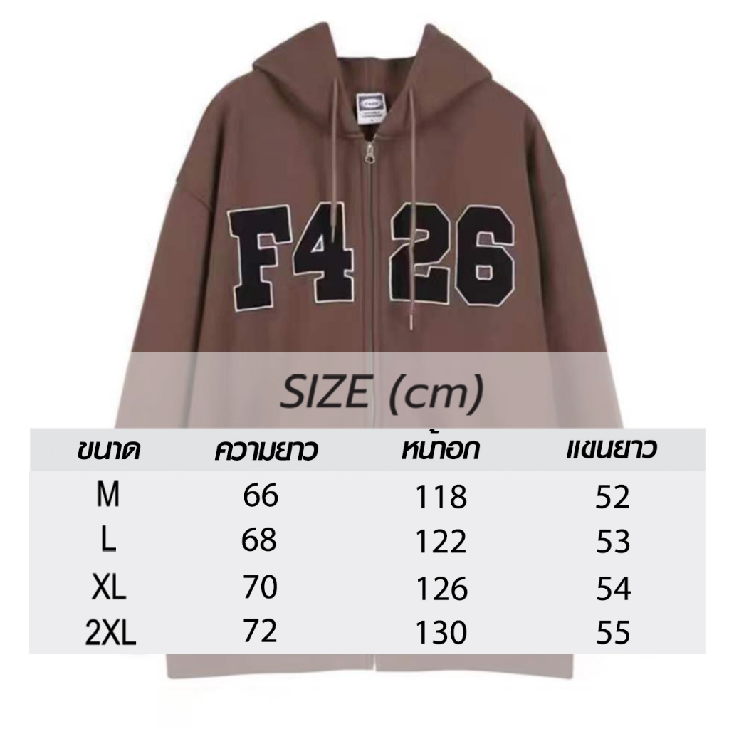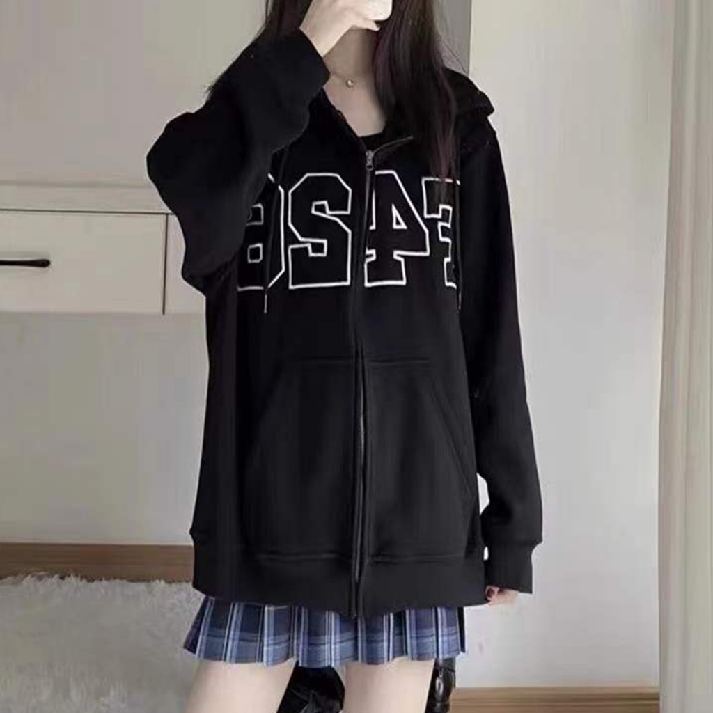 เสื้อแจ็กเก็ตกันหนาว มีฮู้ด แต่งซ ิป พิมพ์ลายตัวอักษร ทรงหลวม