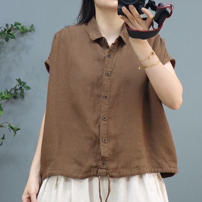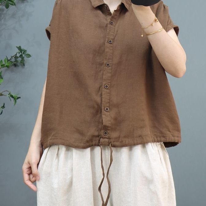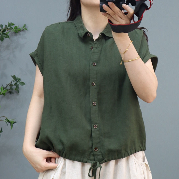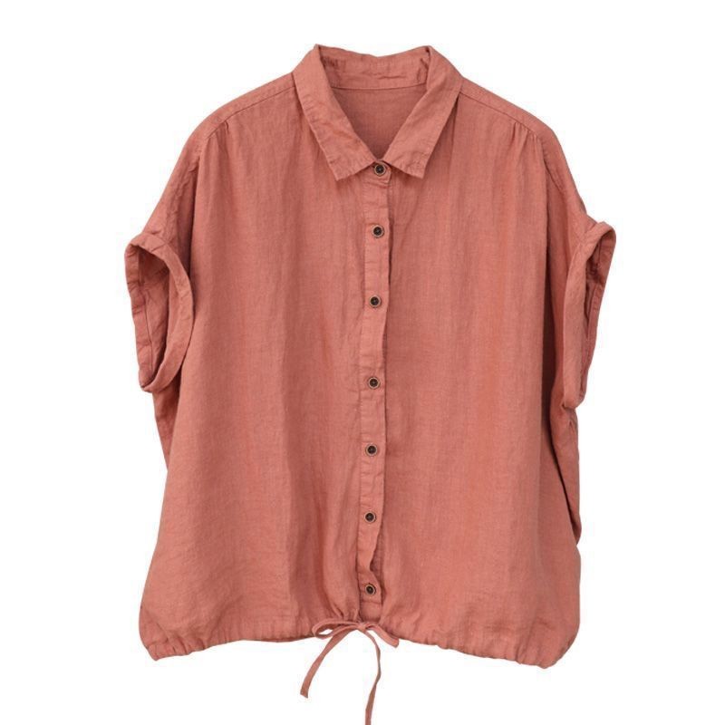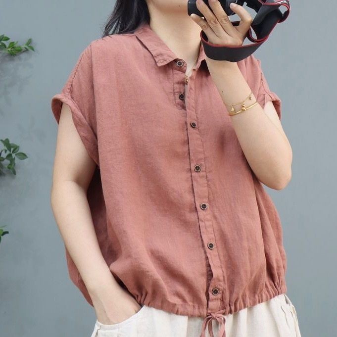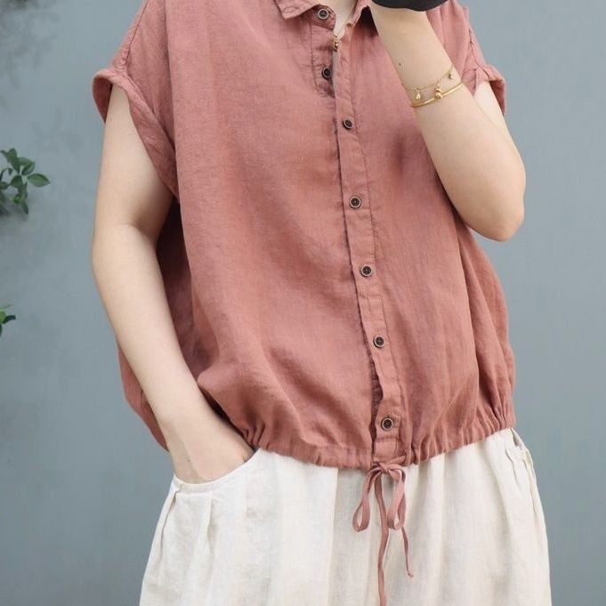 M MG [เสื้อผ้าผู้หญิง] ฤดูร้อนผ้าฝ้ายผ้าลินินผู้หญิง Retro Casual All-Match Hem Drawstring แขนสั้นกลางอายุแม่หลวมปก Belly Top