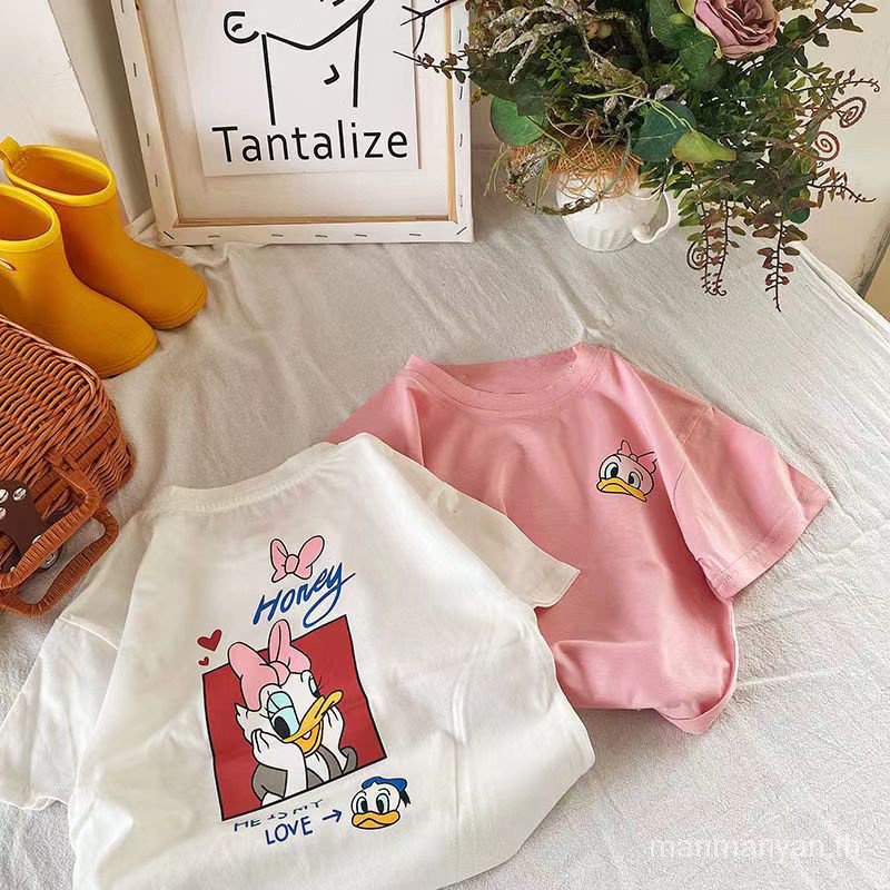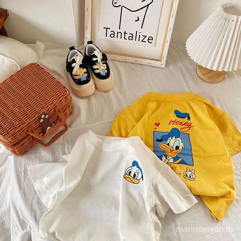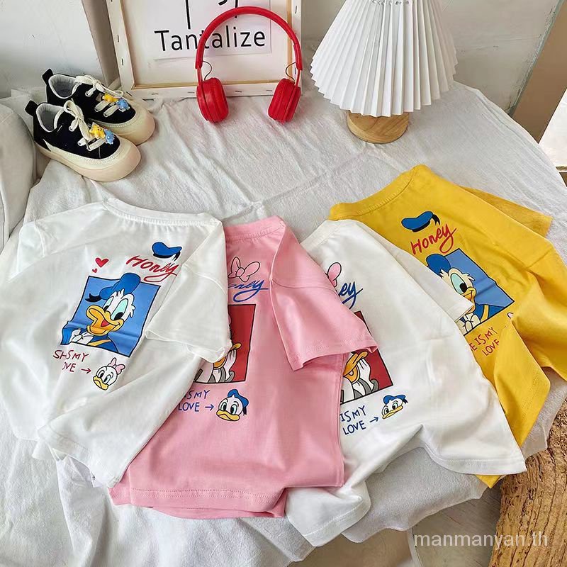 เสื้อยืดแขนสั้น คอกลม ผ้าฝ้ายแท้ พิมพ์ลายการ์ตูนเป็ดโดนัลด์ ทรงหลวม แฟชั่นฤดูร้อน สําหรับเด็กผู้ชาย และเด็กผู้หญิง