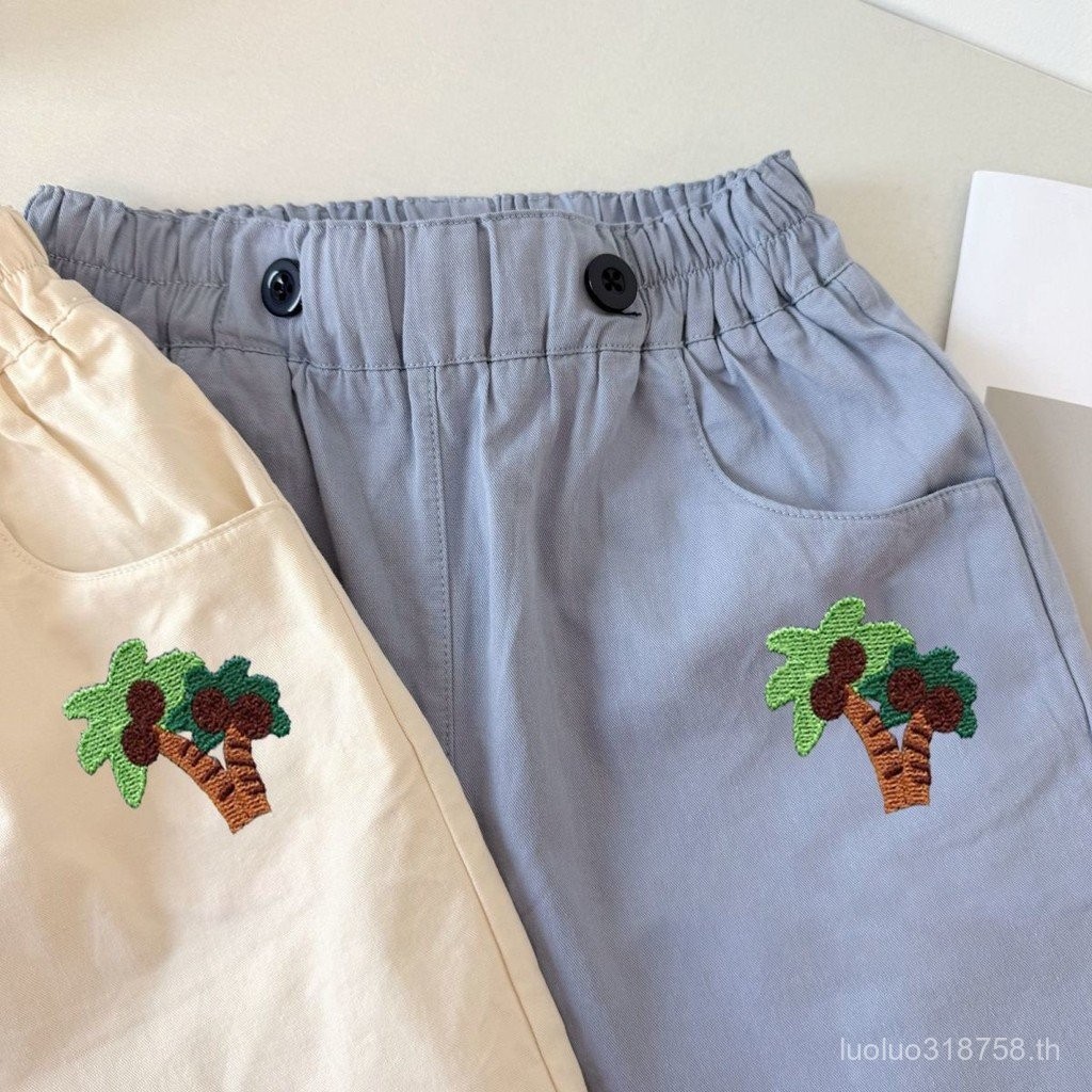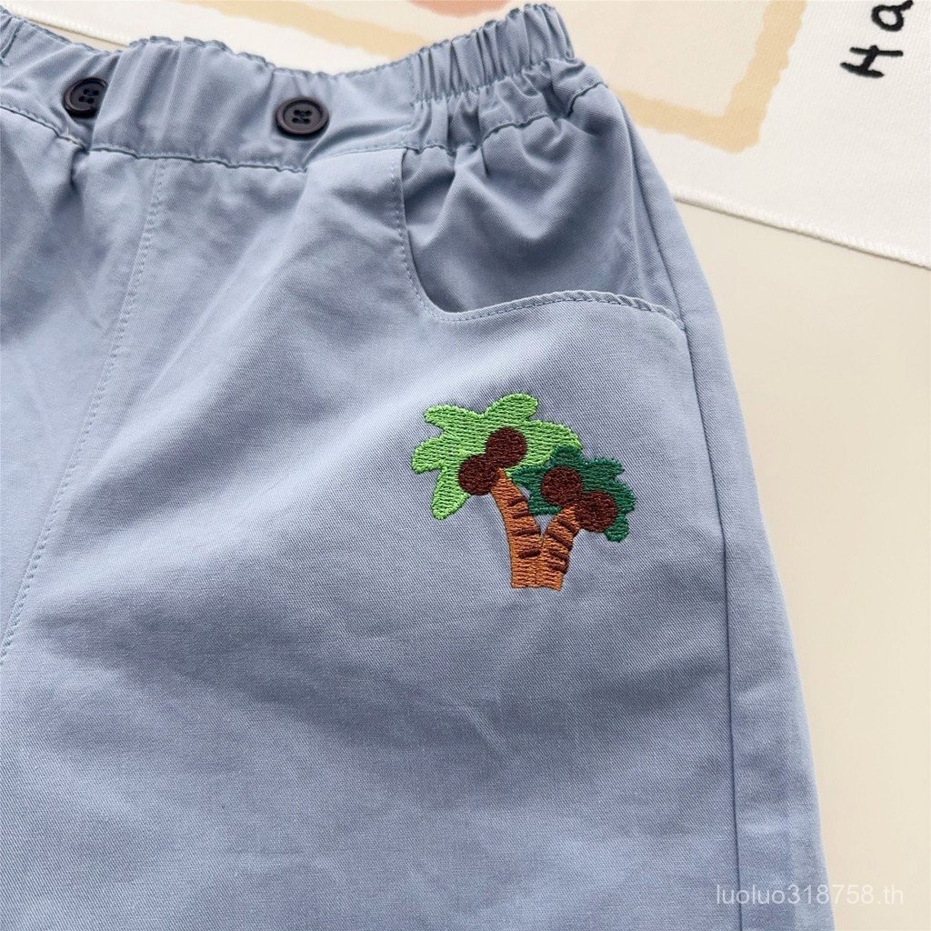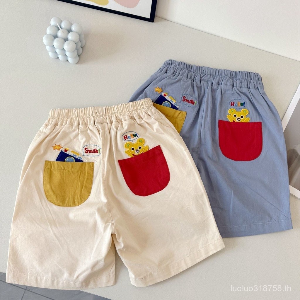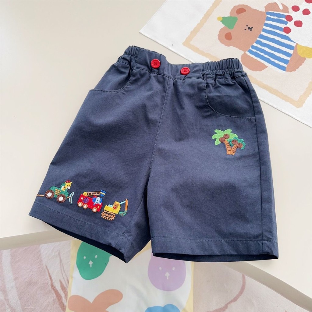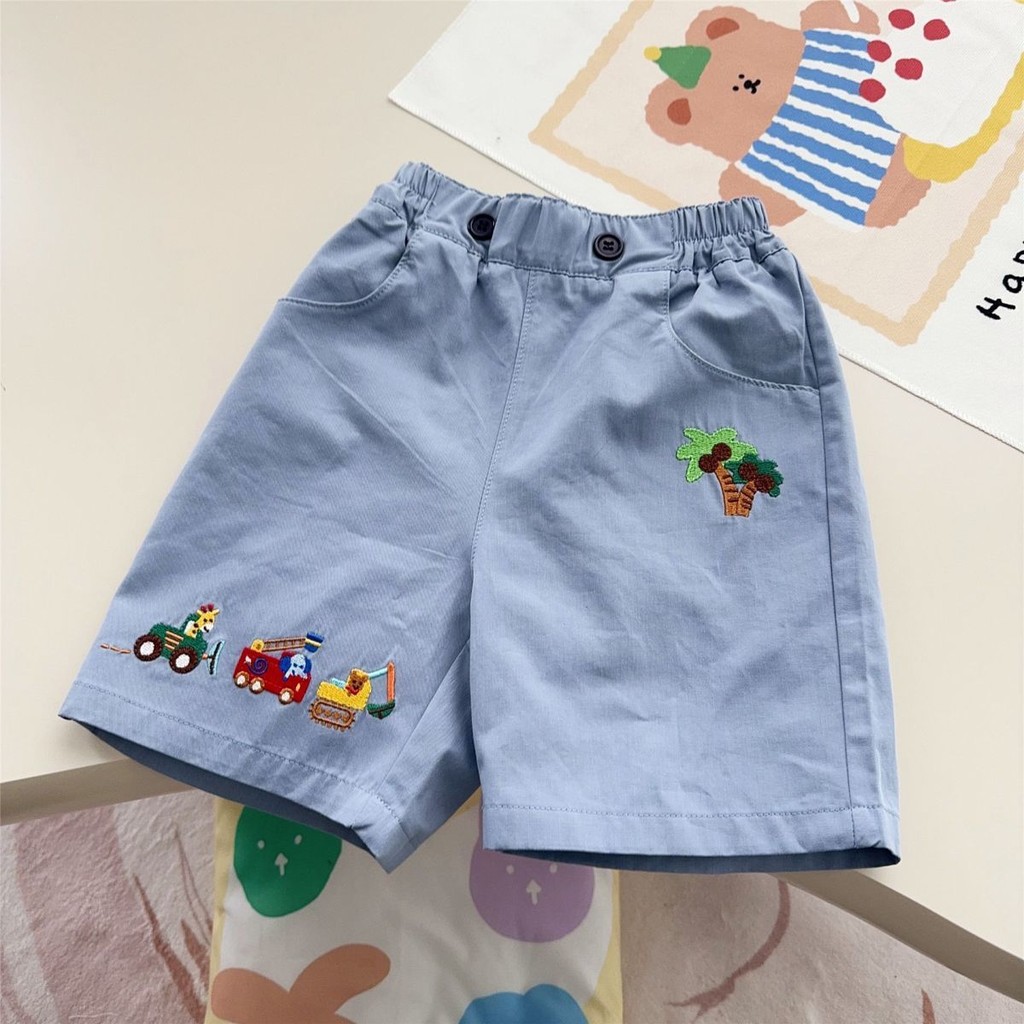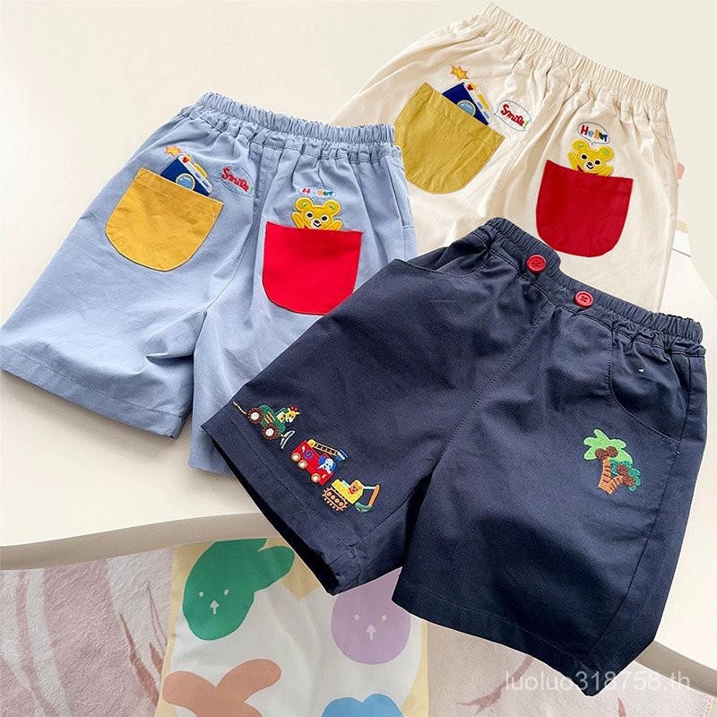 ฤดูร้อนใหม่ แพทช์การ์ตูนรถขุด กางเกงขาสั้นปักลายห้าจุดสำหรับเด็กชายและเด็กหญิง สบายๆ