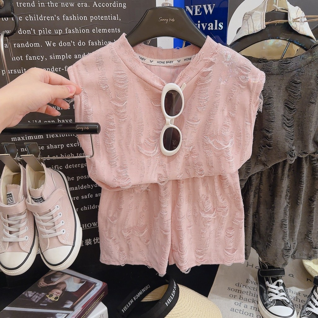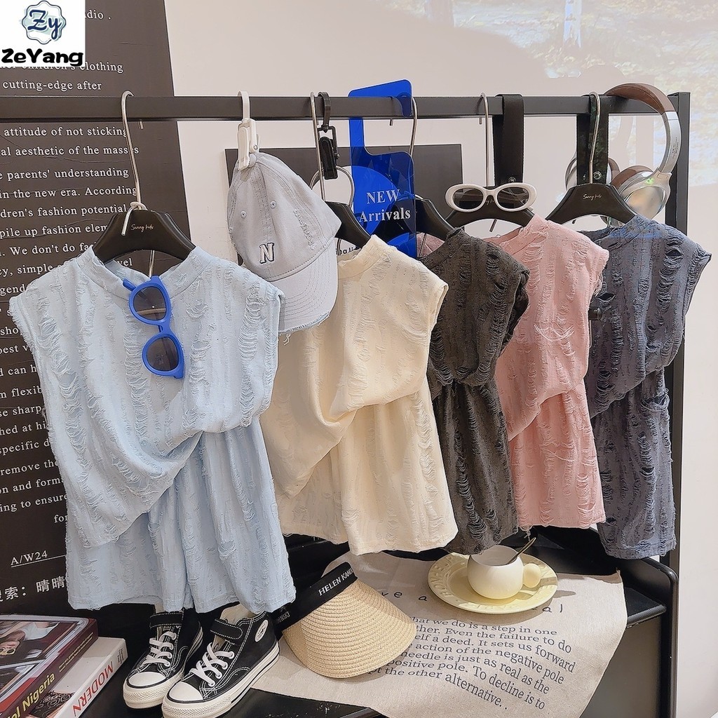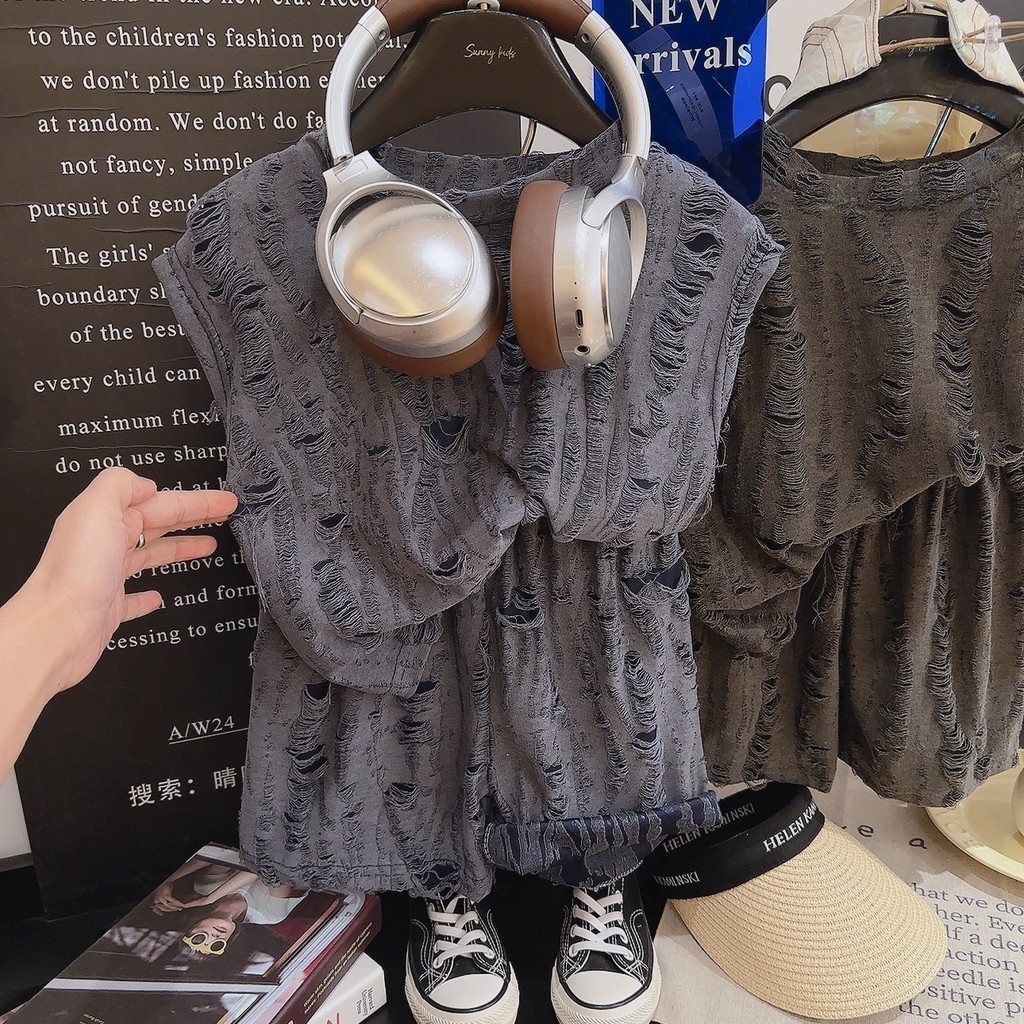 [ZY] 70-140พร้อมสต็อกเด็กเสื้อกั๊กสบายๆชุดย้อนยุคฉีกแขนกุดชุดเด็กระบายอากาศเสื้อกั๊กหลวมกางเกงขาสั้นแฟชั่นเสื้อผ้าเด็กจัดส่งที่รวดเ