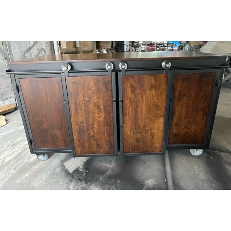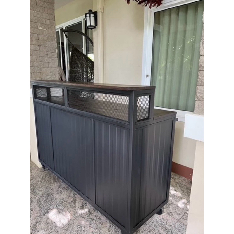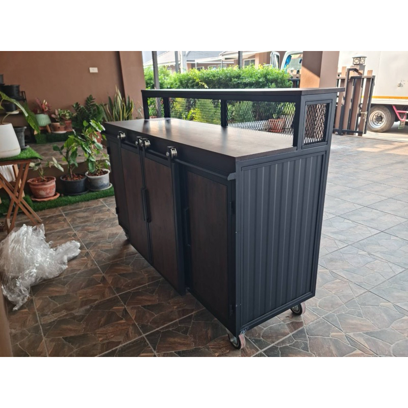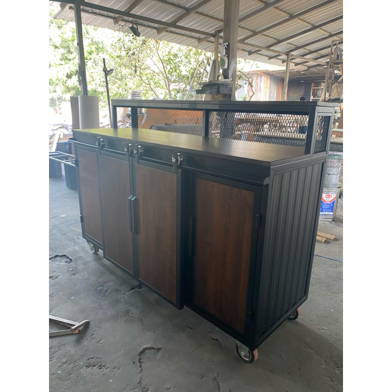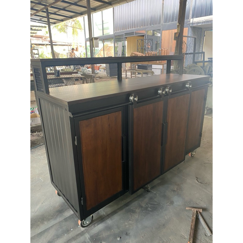 เคาน์เตอร์ประตูทึบ บานสไลด์ตรงกลางทำจากไม้ยางพารา#ขนาดยาว150x50x90ระดับบาร์20Cmด้านข้างและด้านหลังเป็นเมทัลชีส#ตู้ไม้