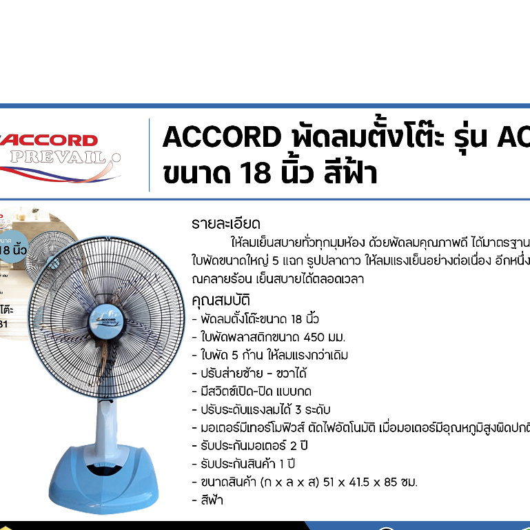 Accord Prevail AC-1881 พัดลมตั้งโต๊ะ 18 นิ้ว 5 ใบพัดลมไกล,แรง มี 3 สี
