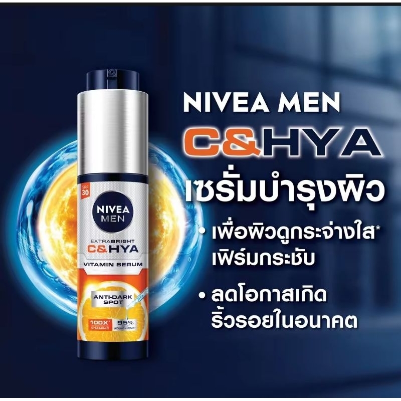 (45ml.)exp.2027เซรั่มกันเเดดนีเวียเมน เอ็กซ์ตร้าไบรท์ซีแอนด์ไฮยาเอจดีเฟนซ์ วิตามินเซรั่ม Nivea Men C&HYA SPF30