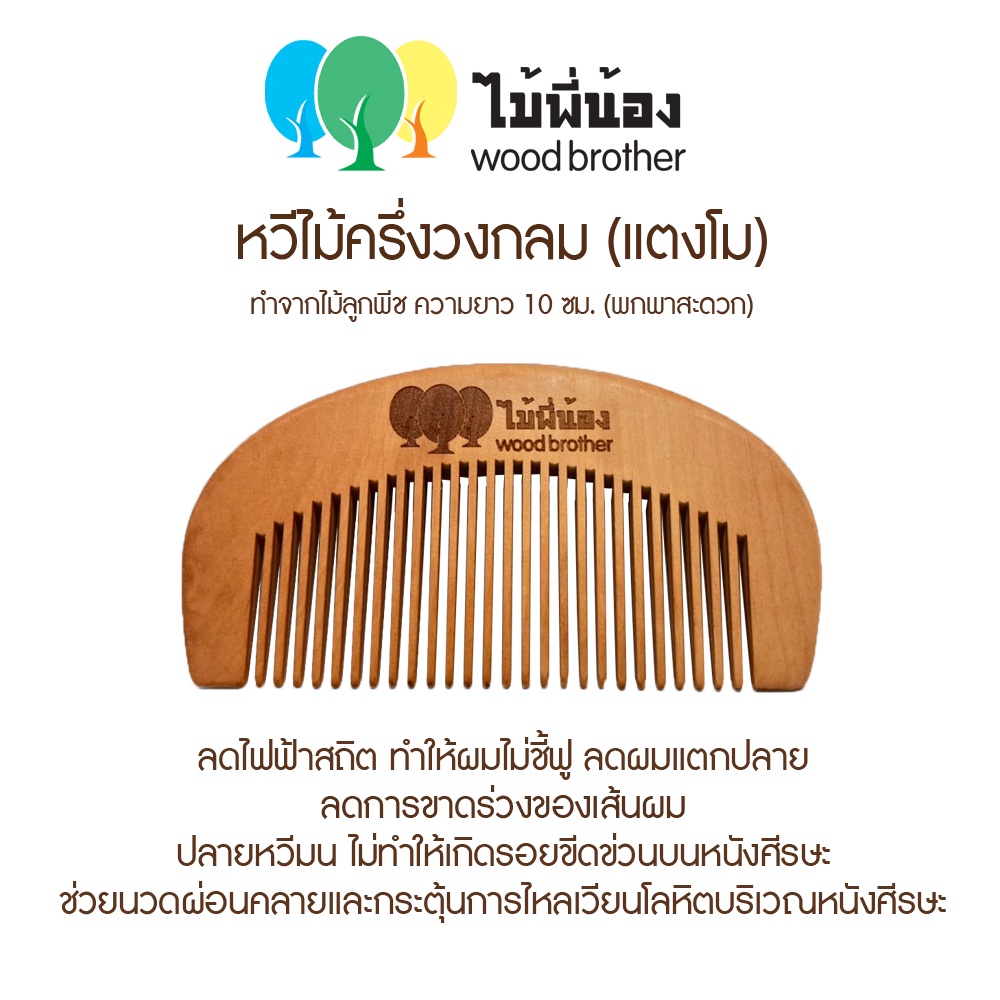 Wood Brother หวีไม้ครึ่งวงกลม ขนาด 10cm ลดไฟฟ้าสถิต เส้นผมไม่ชี้ฟู คุณภาพดี ทนทาน ไม้ลูกพีช ไม้แท้ พกพาสะดวก