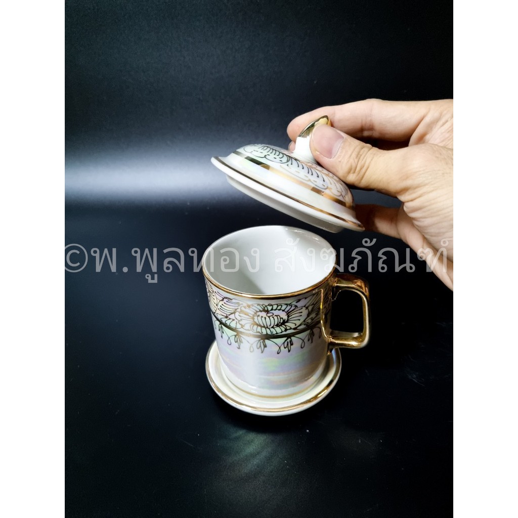 แก้วแบญจรงค์ เคลือบมุก ลายทอง สีขาว งานปราณีต ถวายน้ำพระ