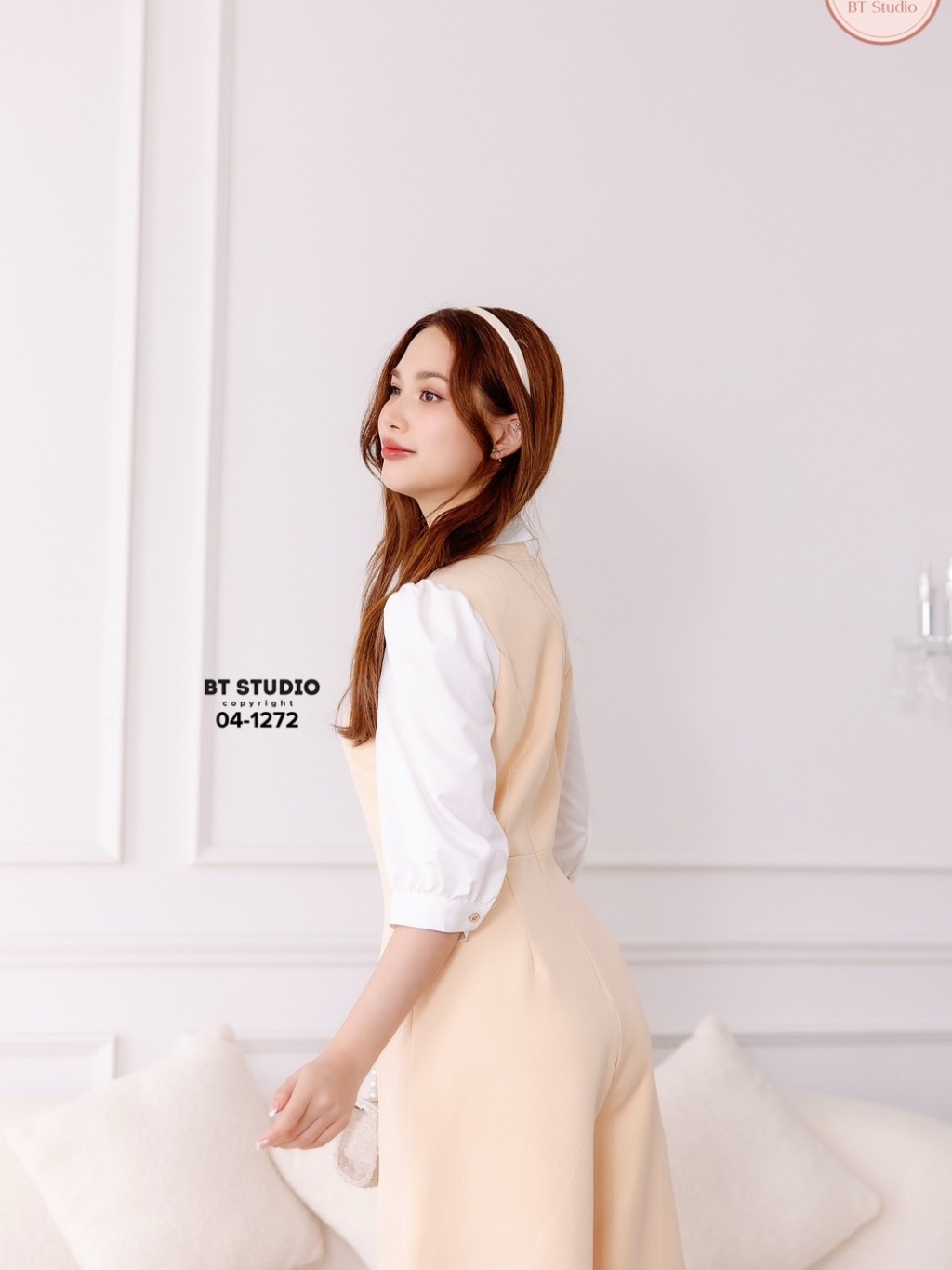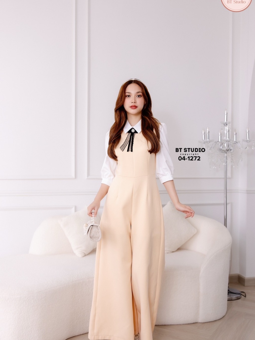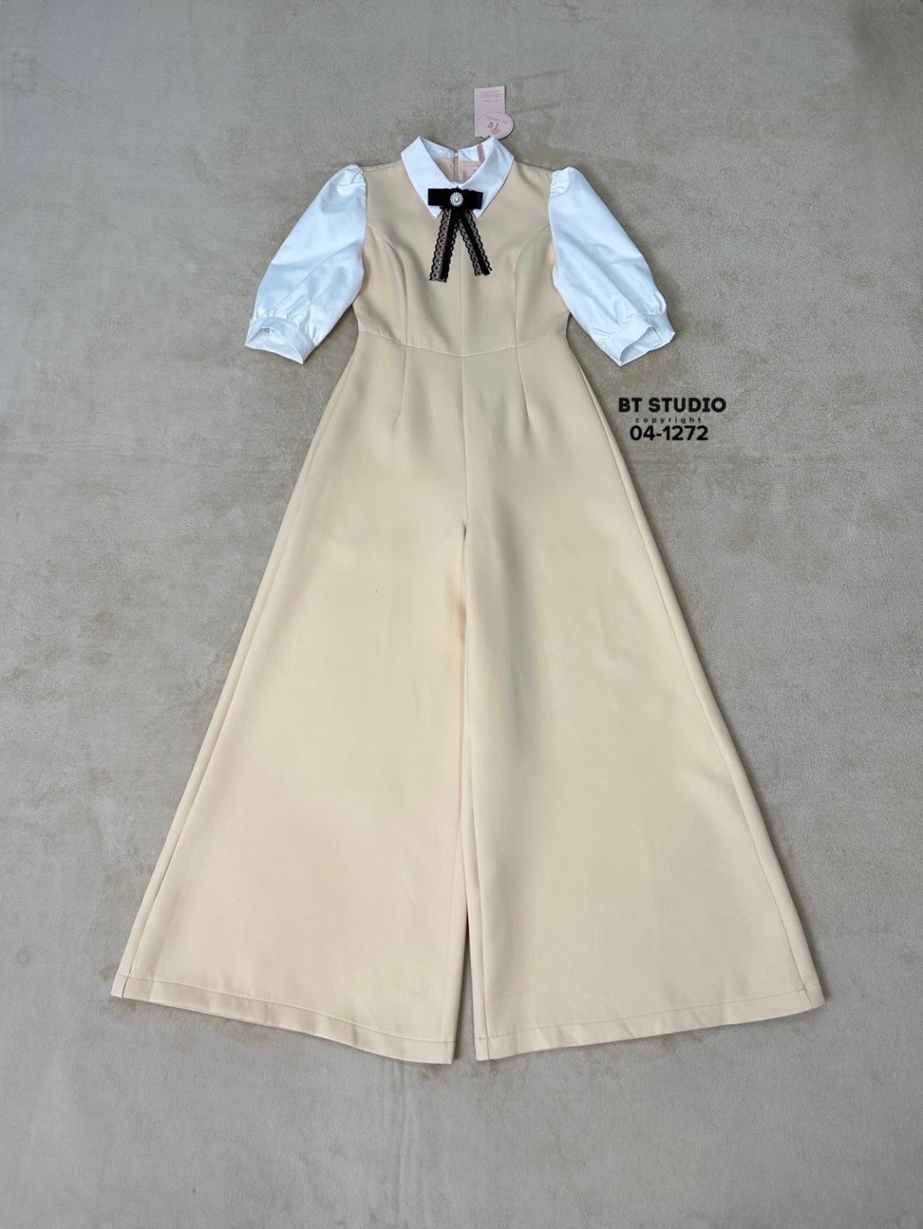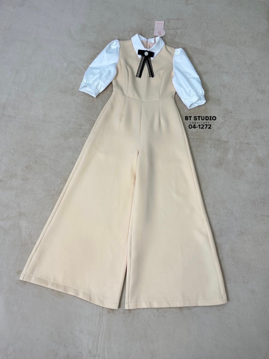 BT 04-1272 จั้มสูทขายาวดีเทลชุดยาวสีครีมเย็บติดคอปกมาพร้อมตัดแขนสีขาว โบเข็มกลัดที่ตรงกลางคอ มีซับใน