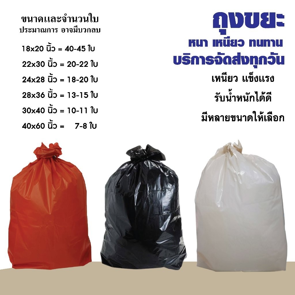 ถุงขยะ สีดำ สีแดง สีขาว คุณภาพดี อย่างหนา ผลิตจากเม็ดพลาสติกอย่างดี มีความเหนียว ทนทาน แพค 1 กก.