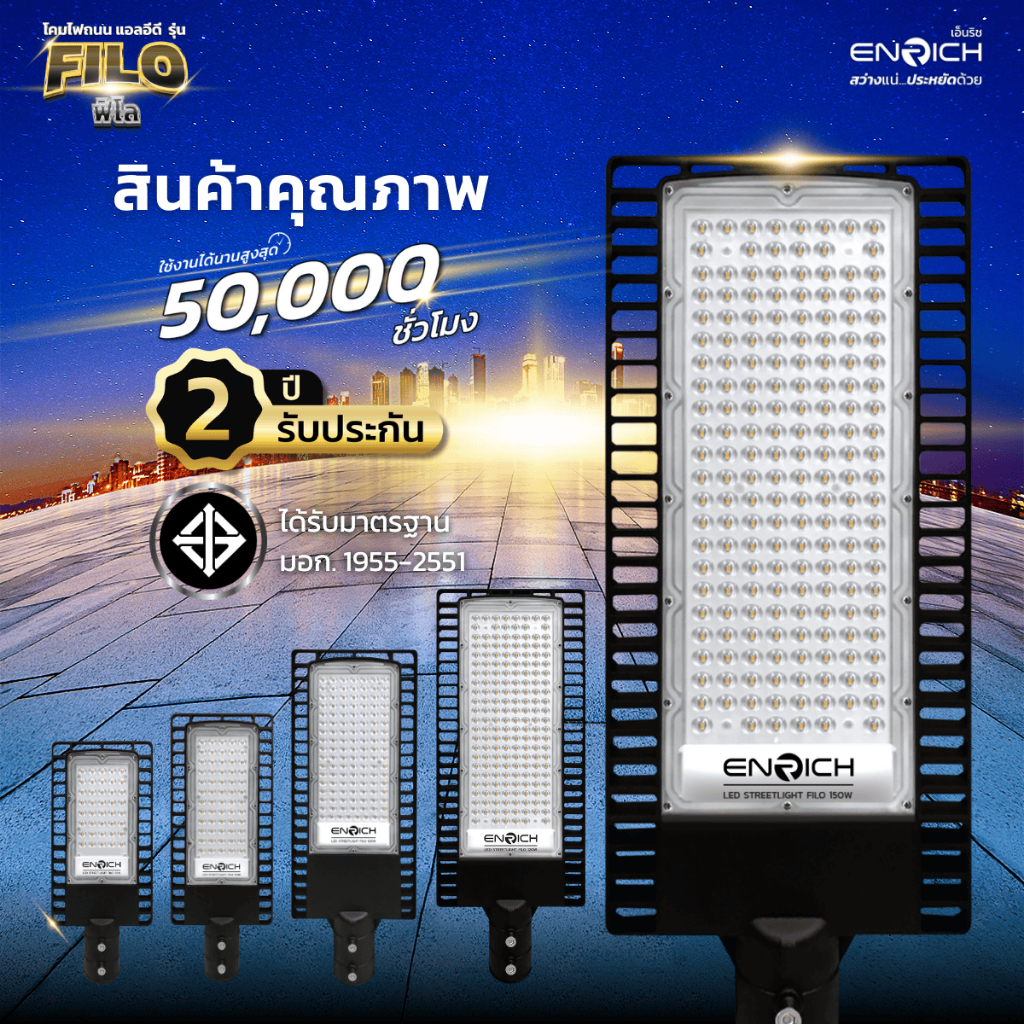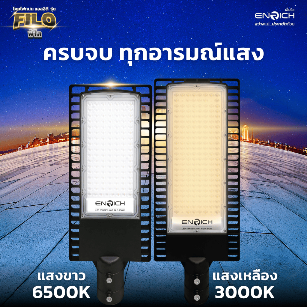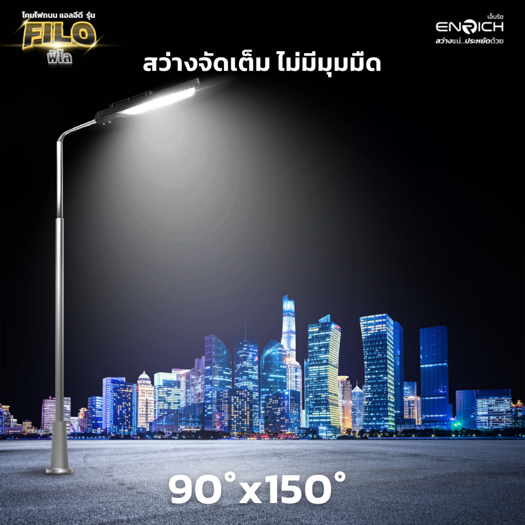 โคมไฟถนน LED ENRICH รุ่น FILO ขนาด 30W-150W แสงขาว เหลือง (รับประกัน 2 ปี) มีมอก. โคมไฟ led กันน้ำ IP65 ไฟถนน led 220v