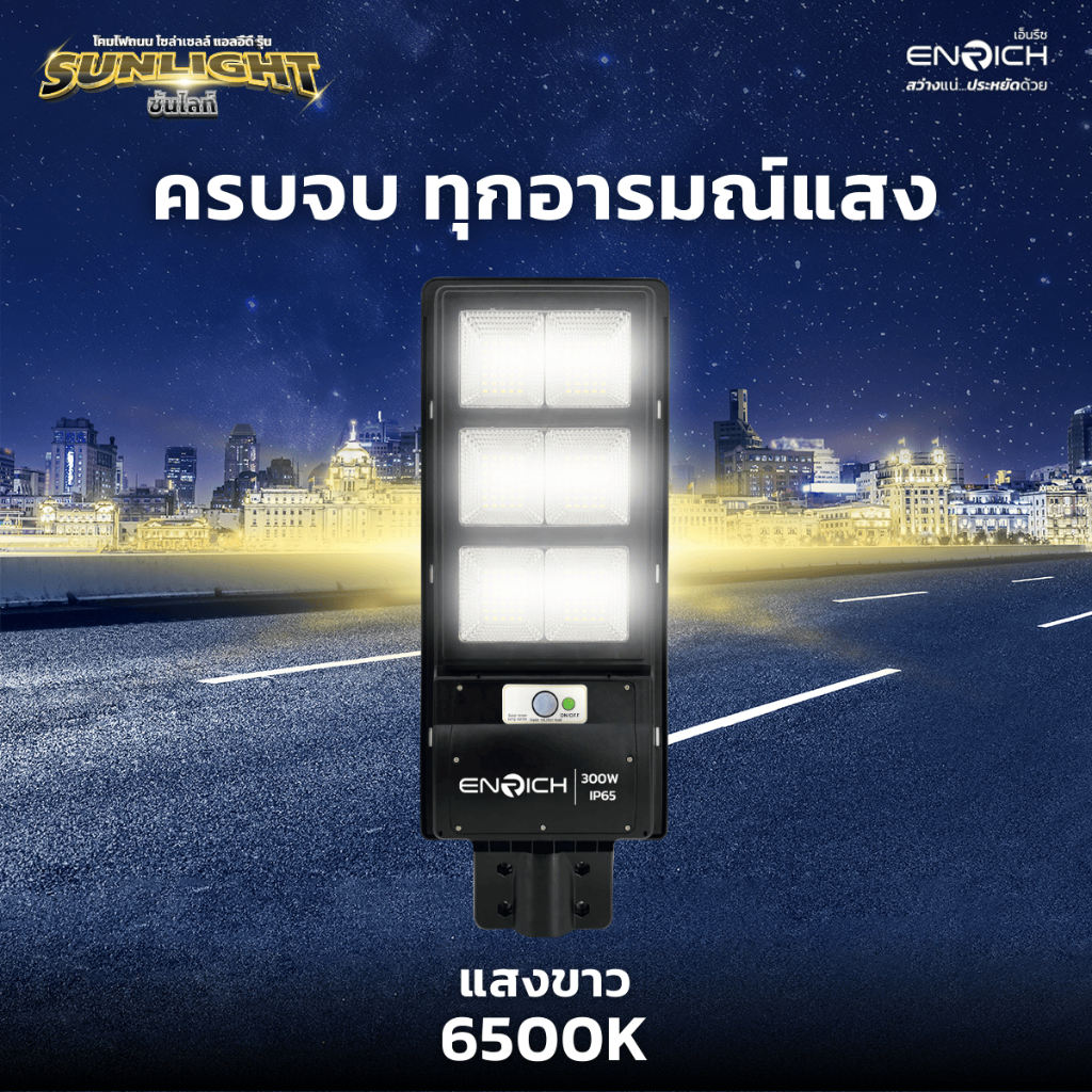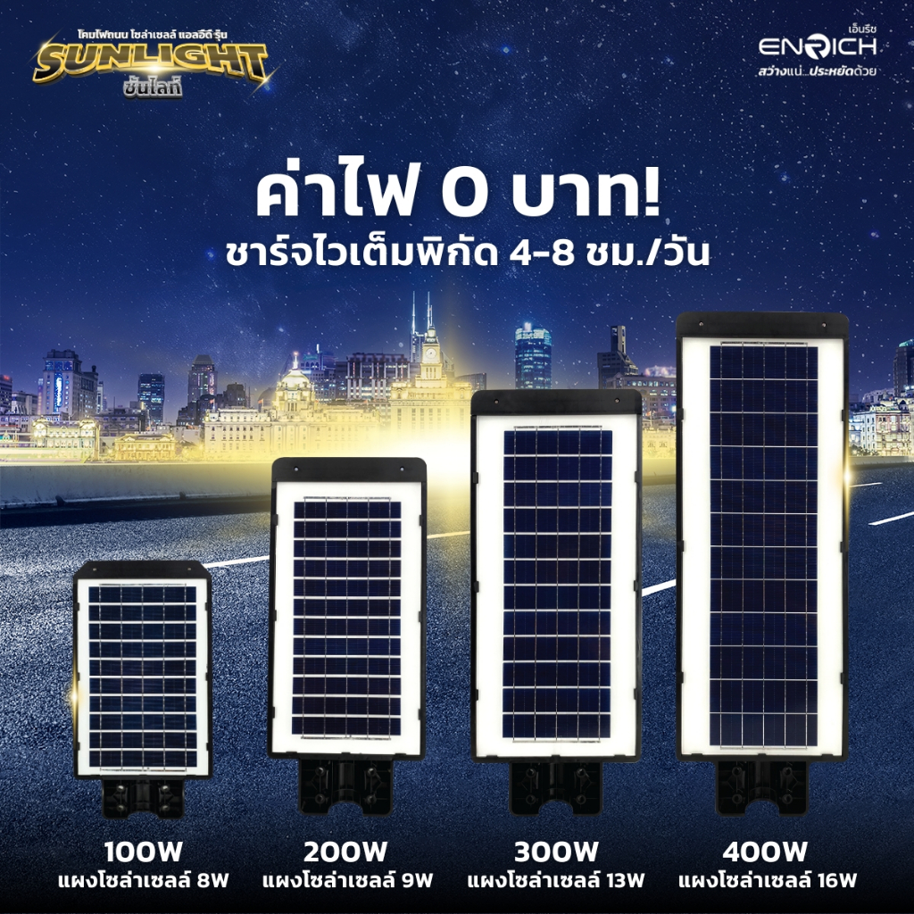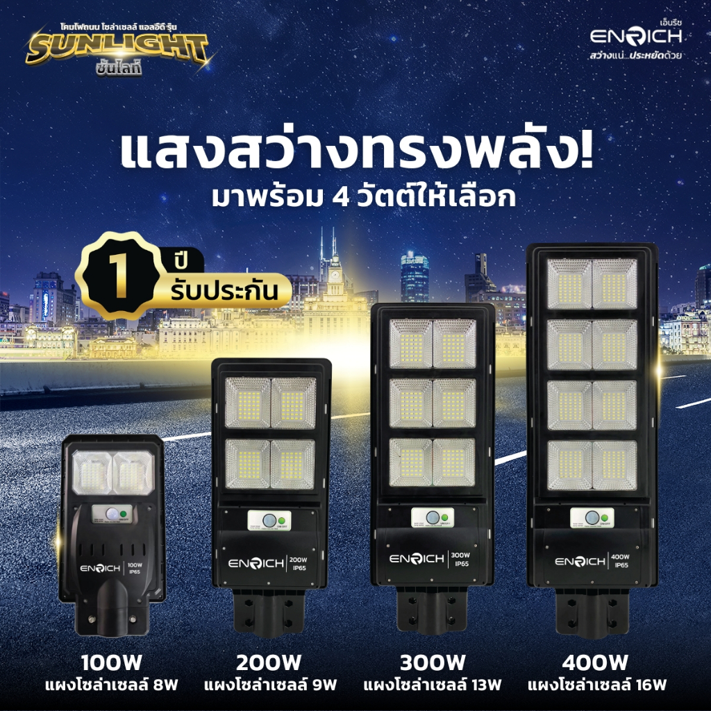 ENRICH โคมไฟถนนโซล่าเซลล์ 100W 200W 300W 400W รุ่น SUNLIGHT แสงขาว พร้อมเซ็นเซอร์ รีโมทคอนโทรล กันน้ำ IP65